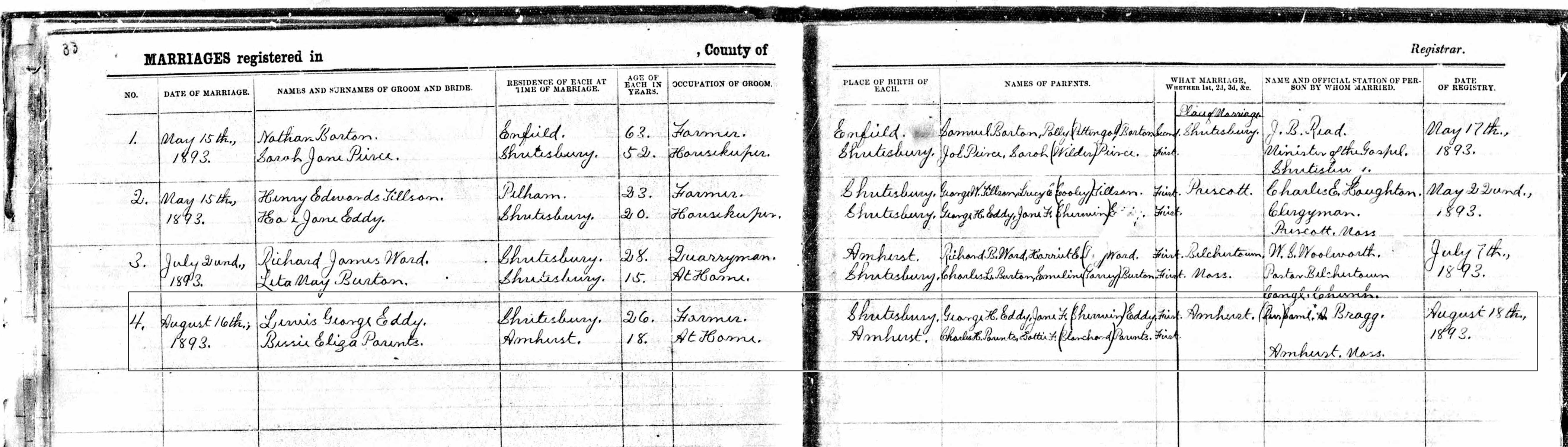Marriage Record of Bessie Eliza Parents and Lewis George Eddy