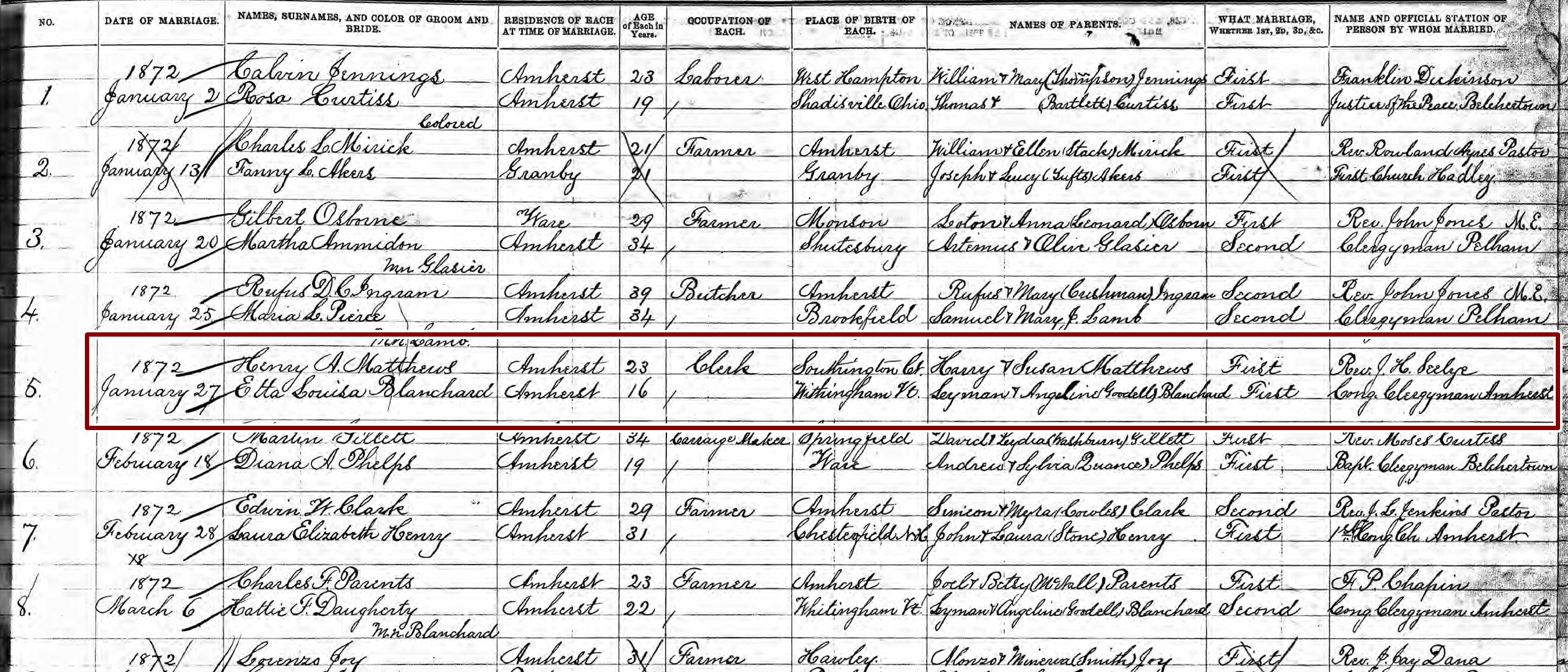 Marriage Record of Etta Louisa Blanchard and Henry A Matthews