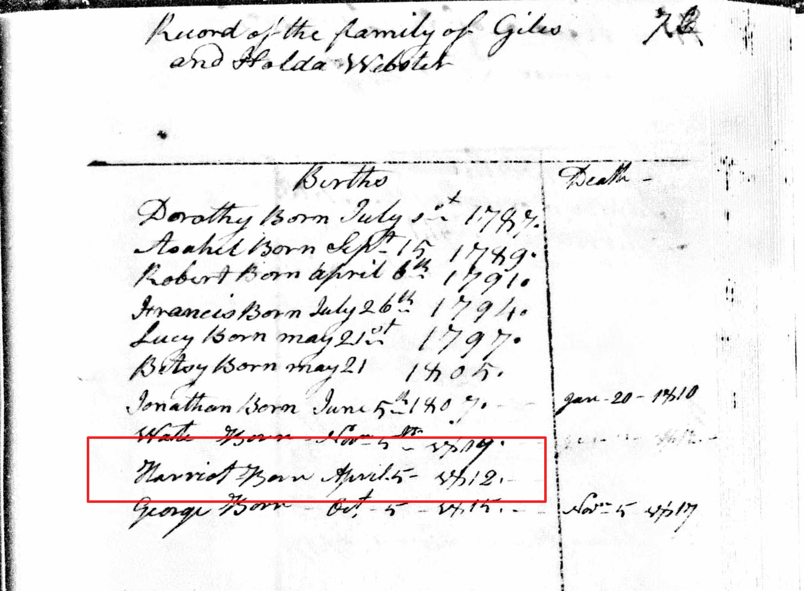 Birth Record of Harriot Webster