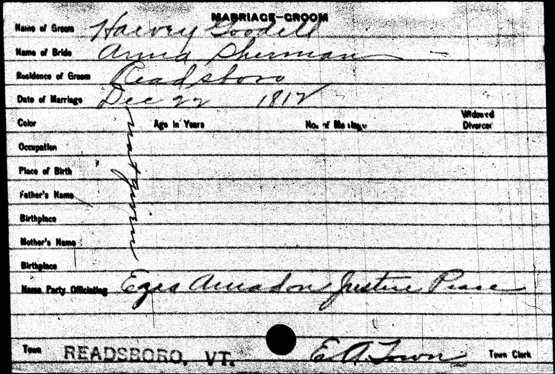 Groom Card of Harvey Goodell