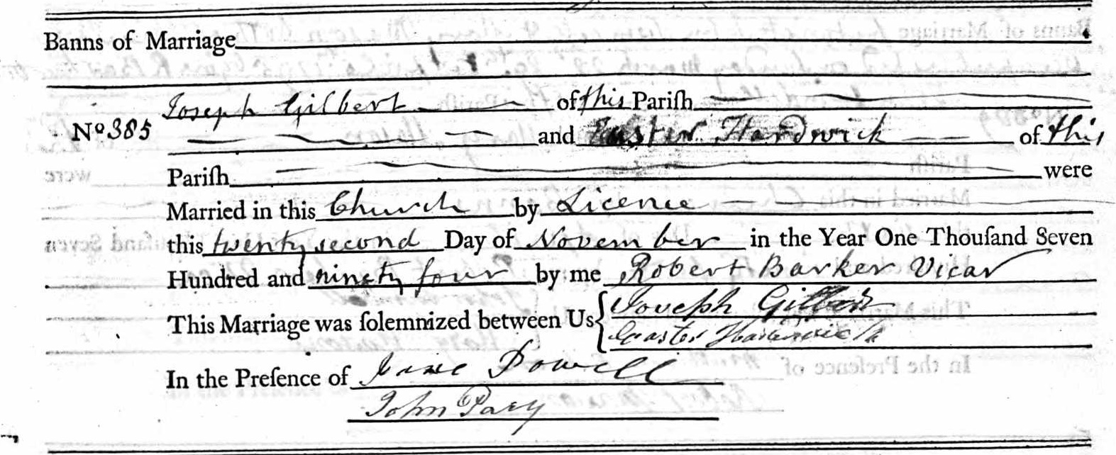 Marriage Record of Ester Hardwick and Joseph Gilbert