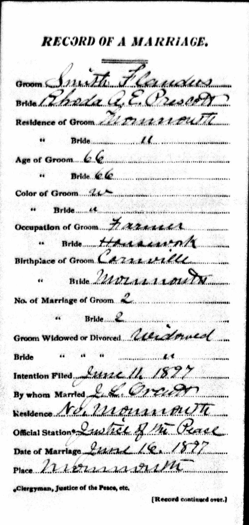 Marriage Record of Rhoda A. E. Prescott and Smith Flanders