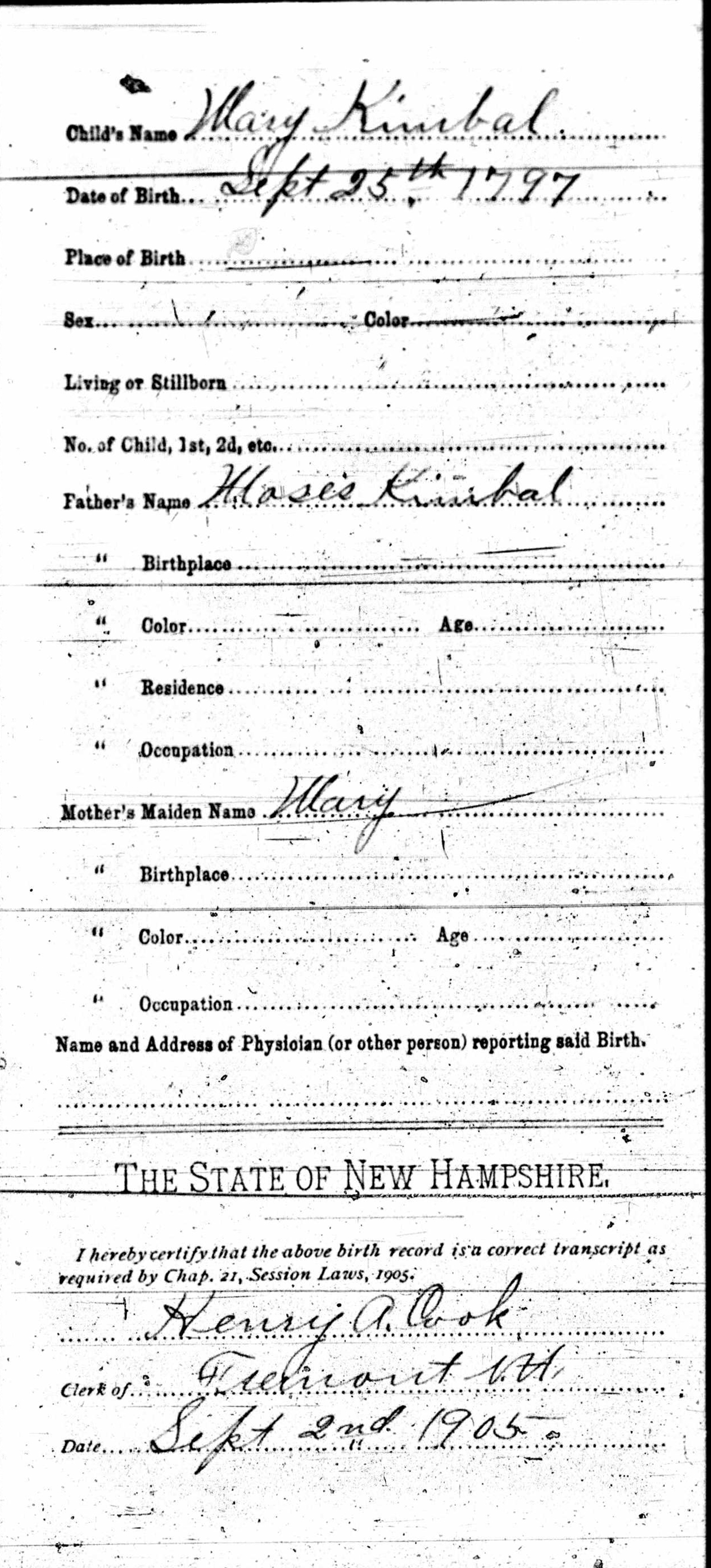 Birth Record of Mary Kimball