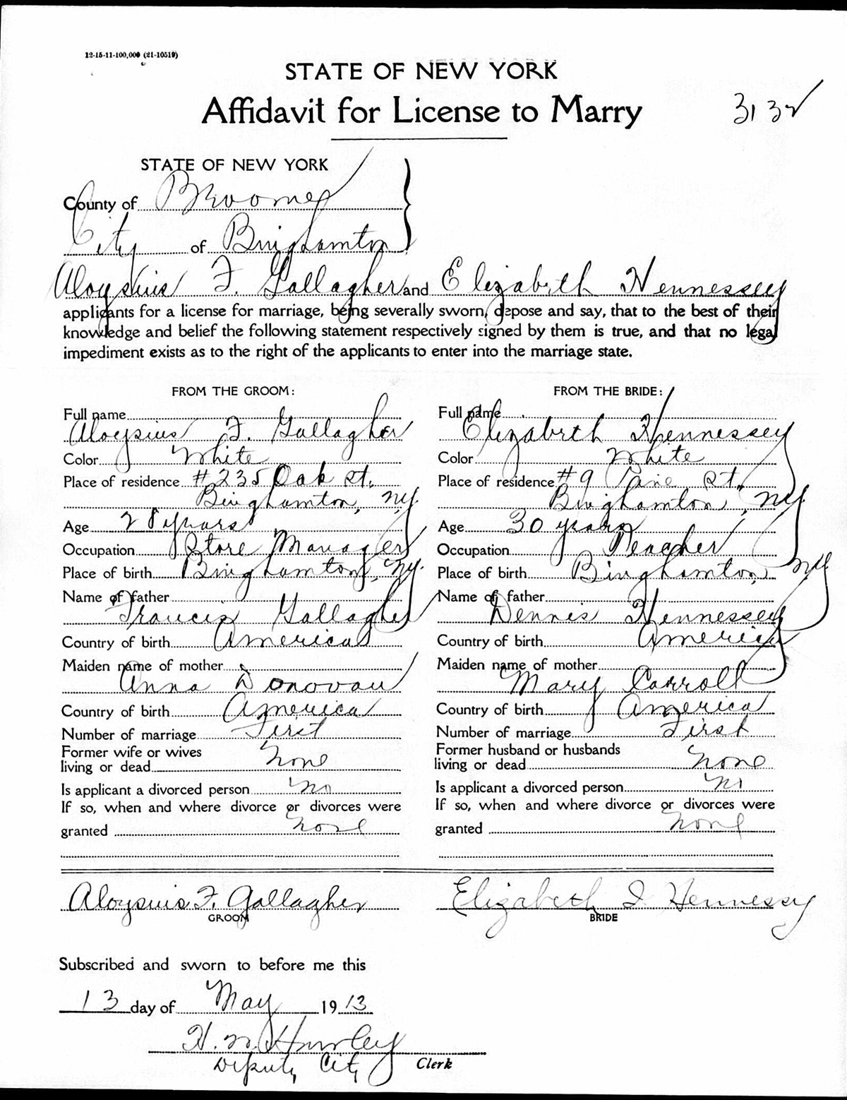 Marriage Record of Elizabeth Hennessey and Aloysius Gallagher