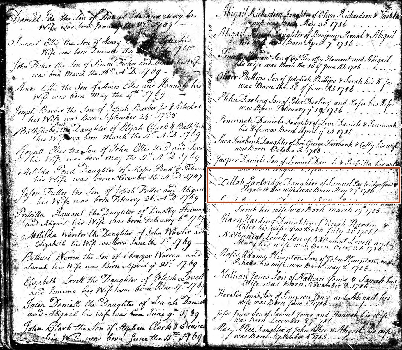 Birth Record of Zillah Partridge