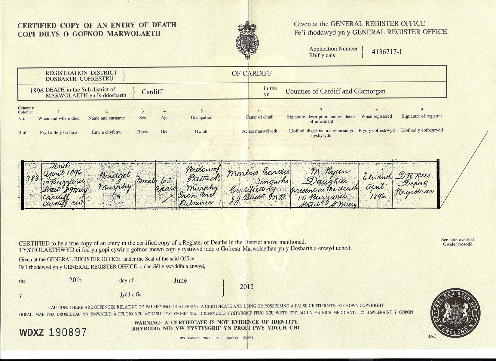 Death Certificate of Bridget Murphy