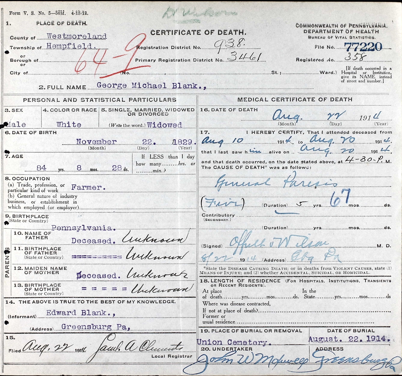 Certificate of Death of George Michael Blank