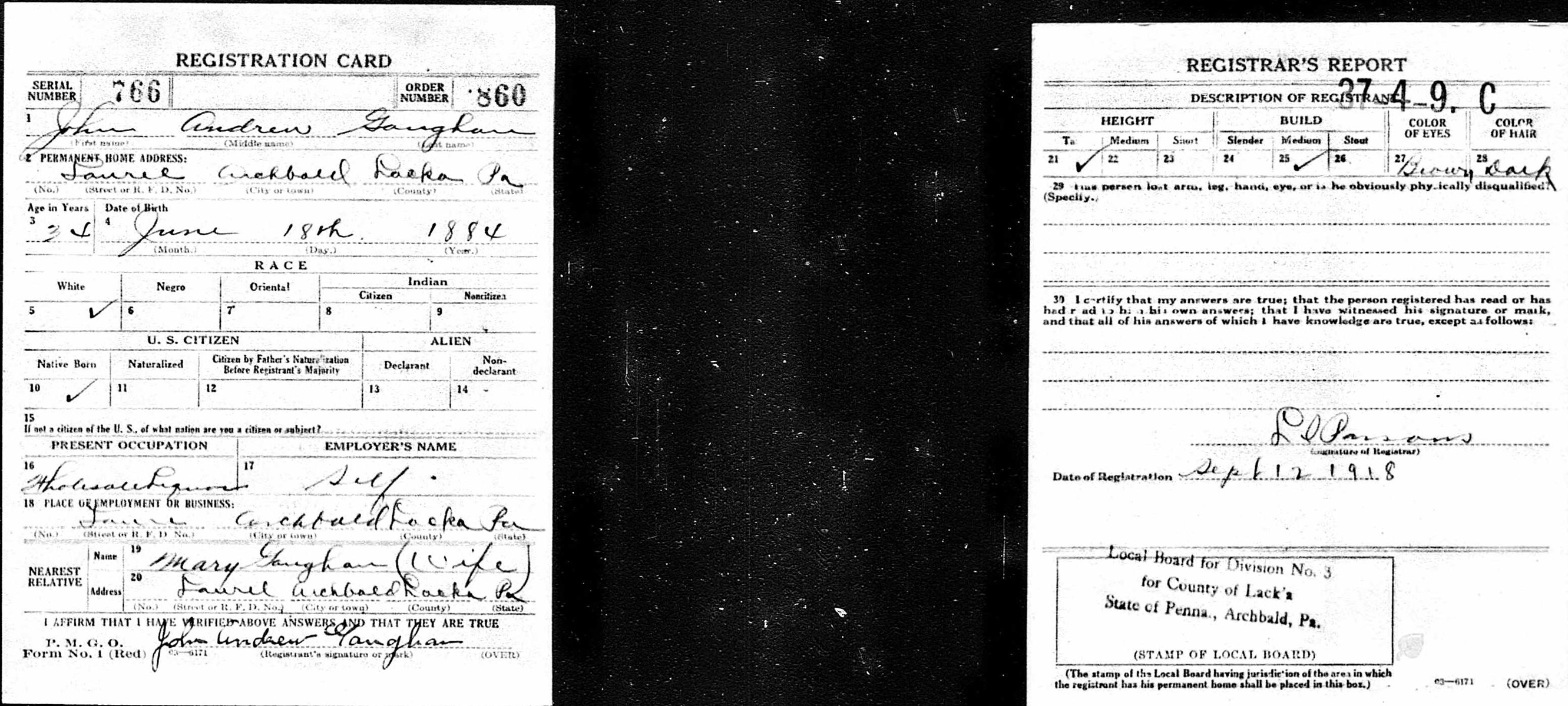 World War I Draft Registration Card of John Andrew Gaughan