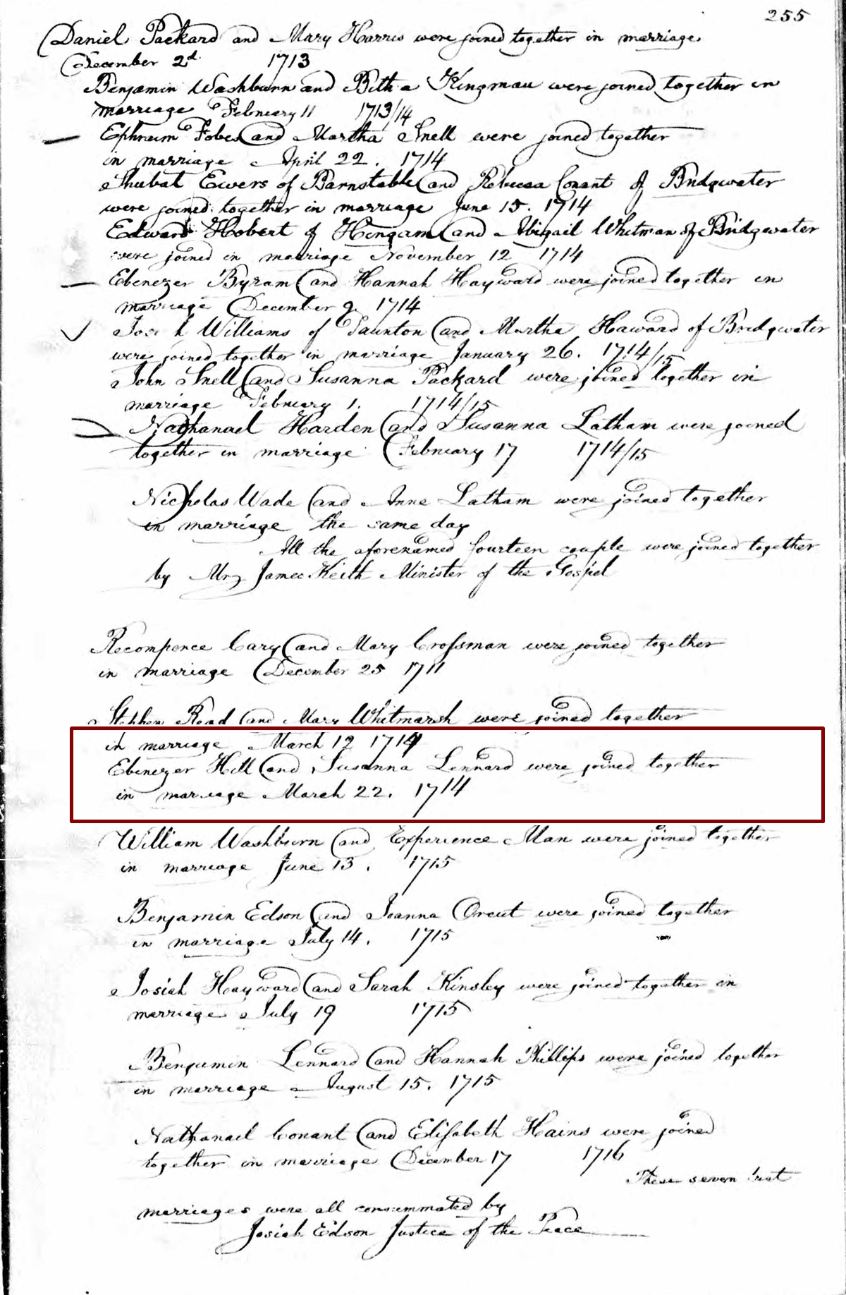 Marriage Record of Susanna Leonard and Ebenezer Hill