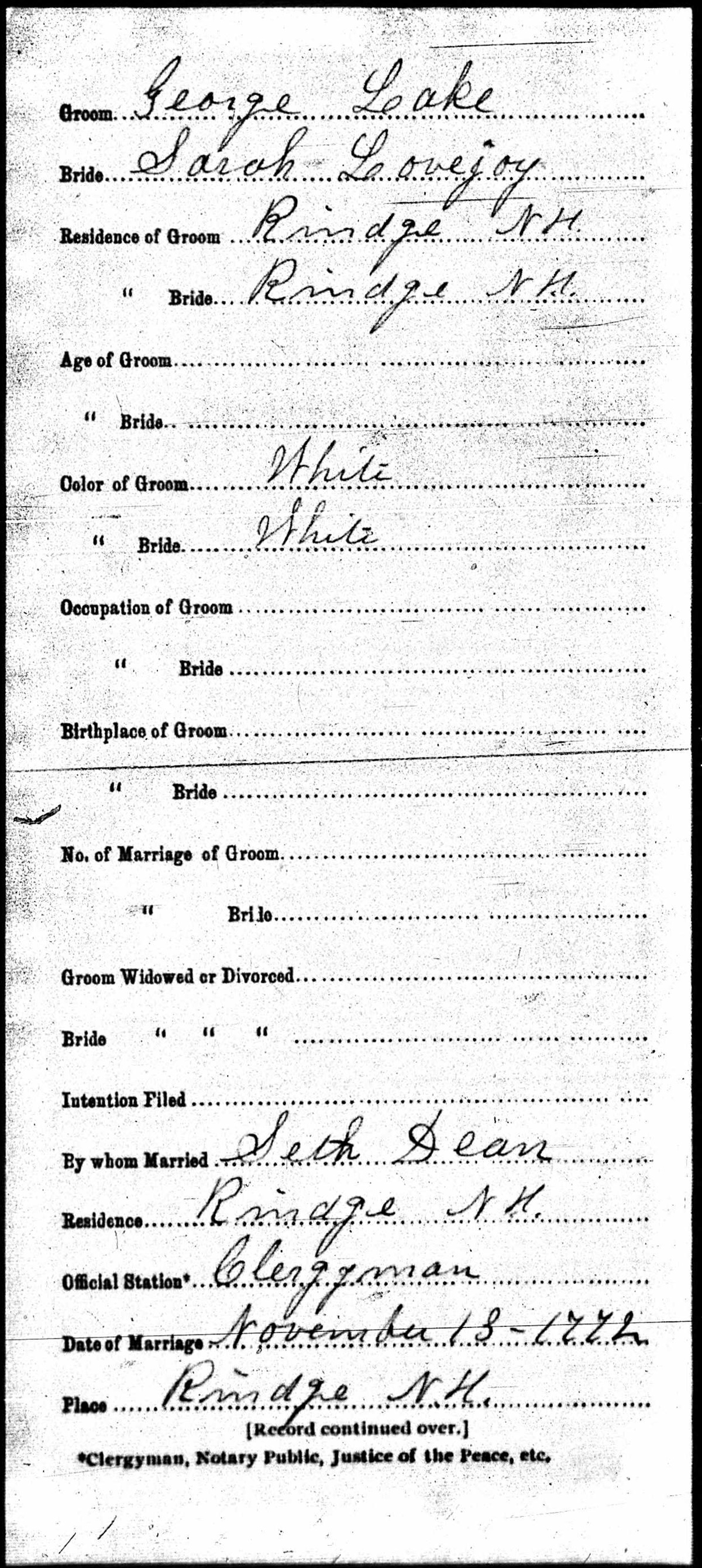 Marriage Record of Sarah Lovejoy and George Lake