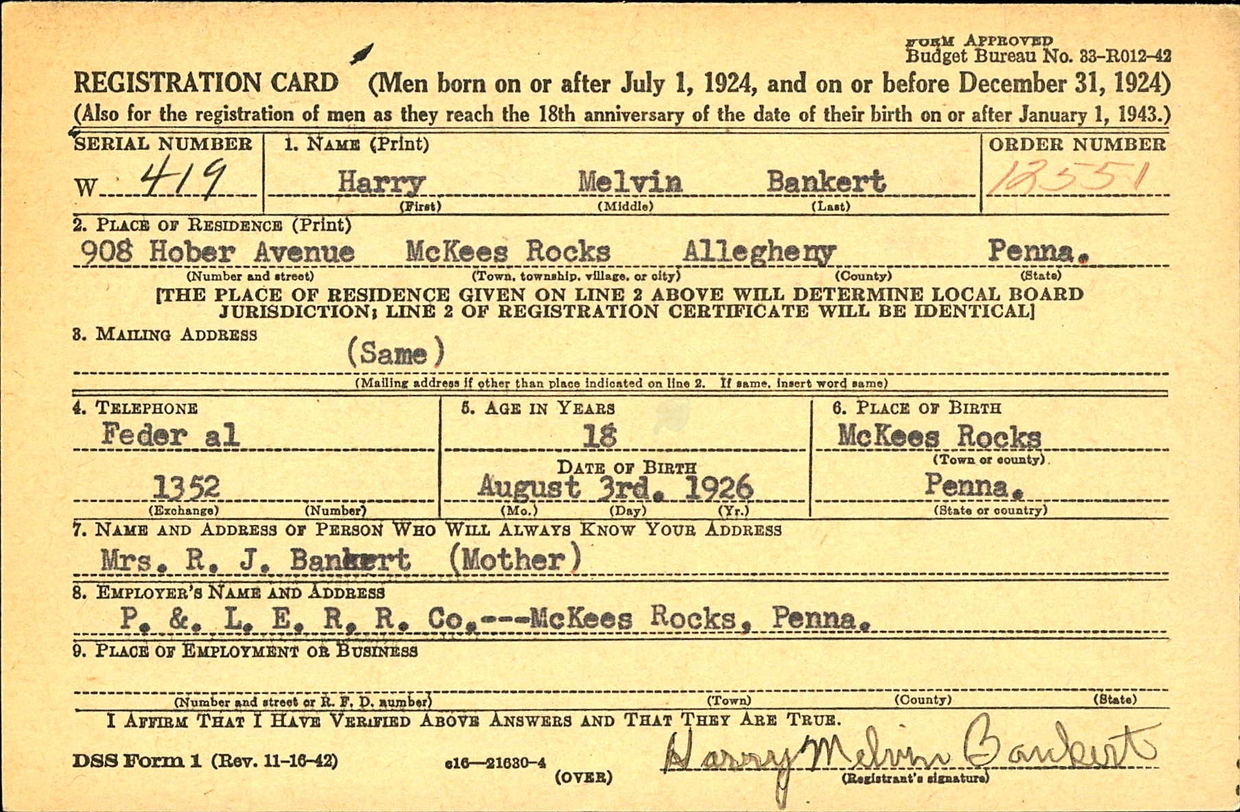 World War II Draft Registration Card of Harry Melvin Bankert