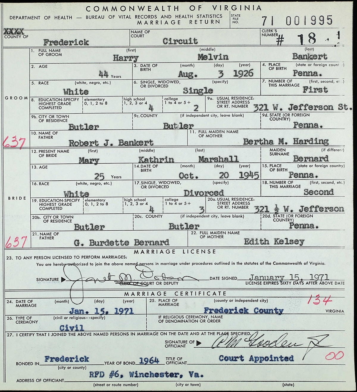 Marriage Record of Mary Kathryn (Bernard) Mashall and Harry Melvin Bankert