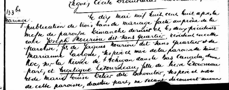 Marriage Record of Angélique Letourneau and Joseph Nouvion