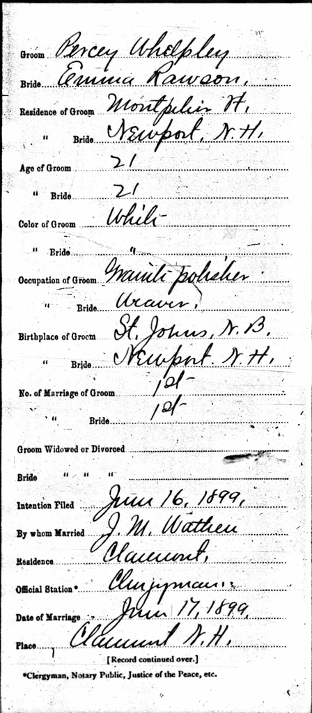 Marriage Record of Percival Whelpley and Emma Rawson