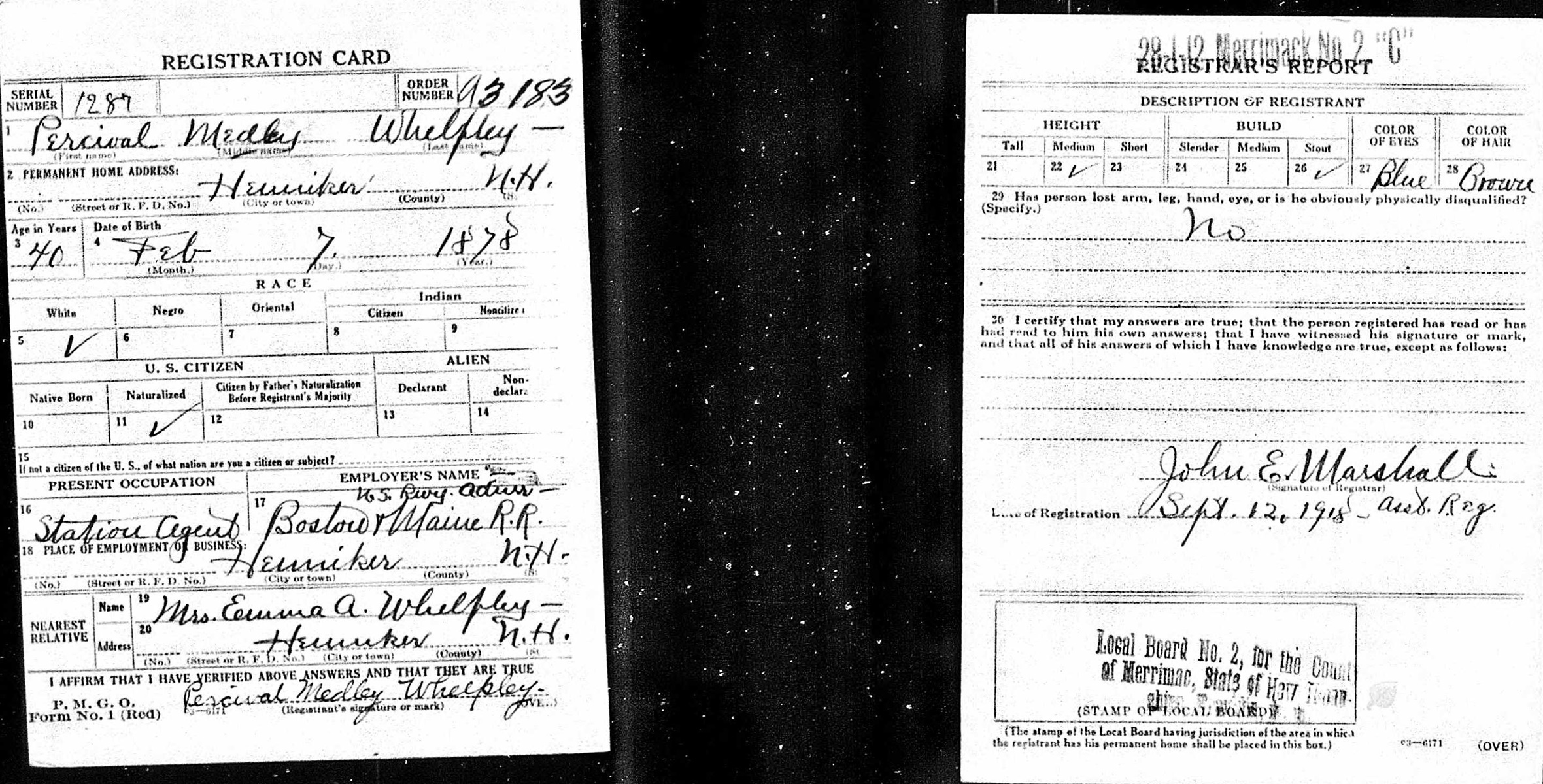 World War I Draft Registration Card of Percival Medley Whelpley