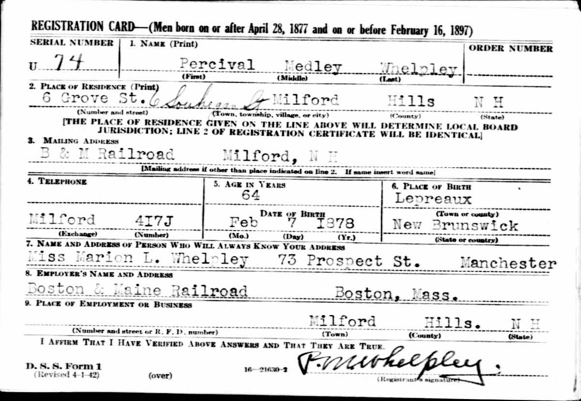 World War II Draft Registration Card of Percival Medley Whelpley