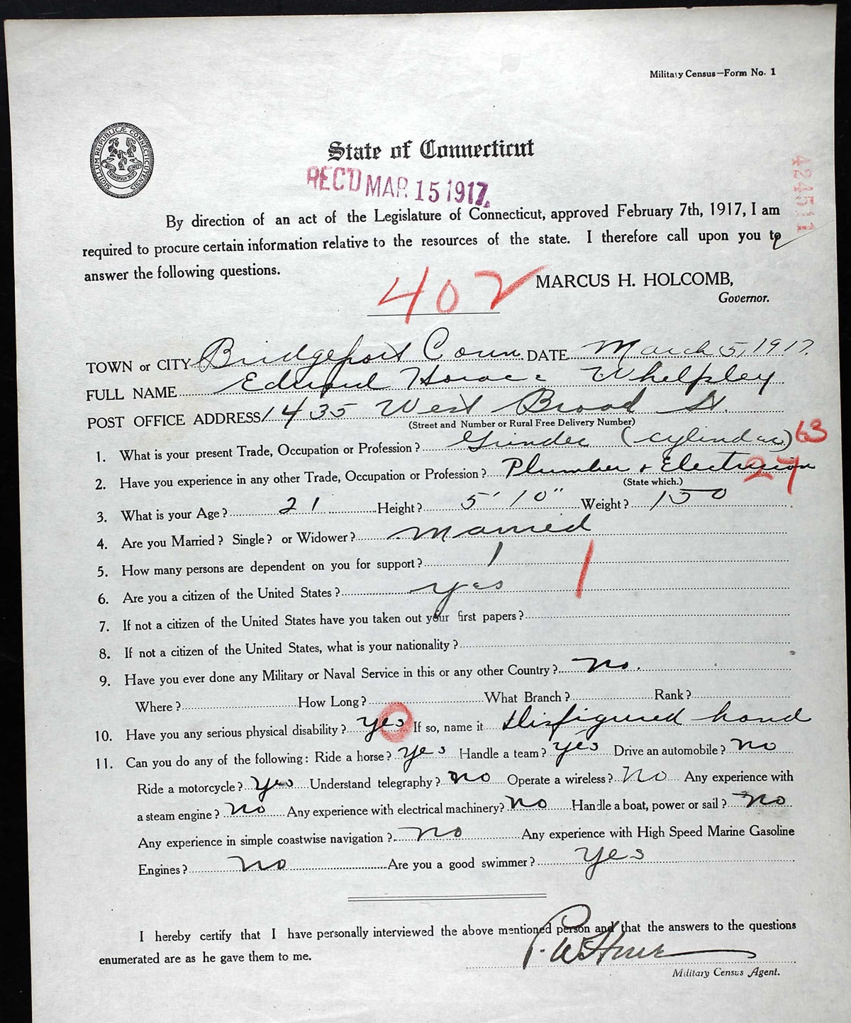 1917 Connecticut Military Census form for Edward Horace Whelpley