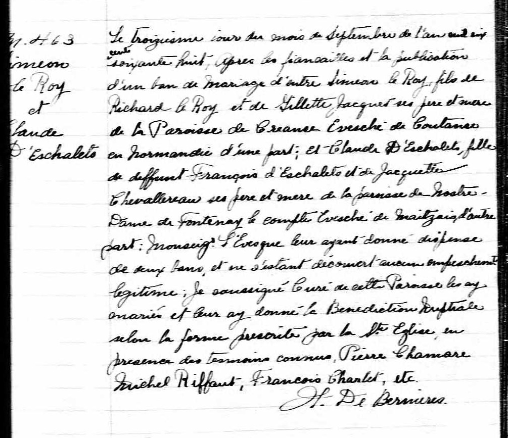 Marriage Record of Claude d'Eschalts and Siméon LeRoy