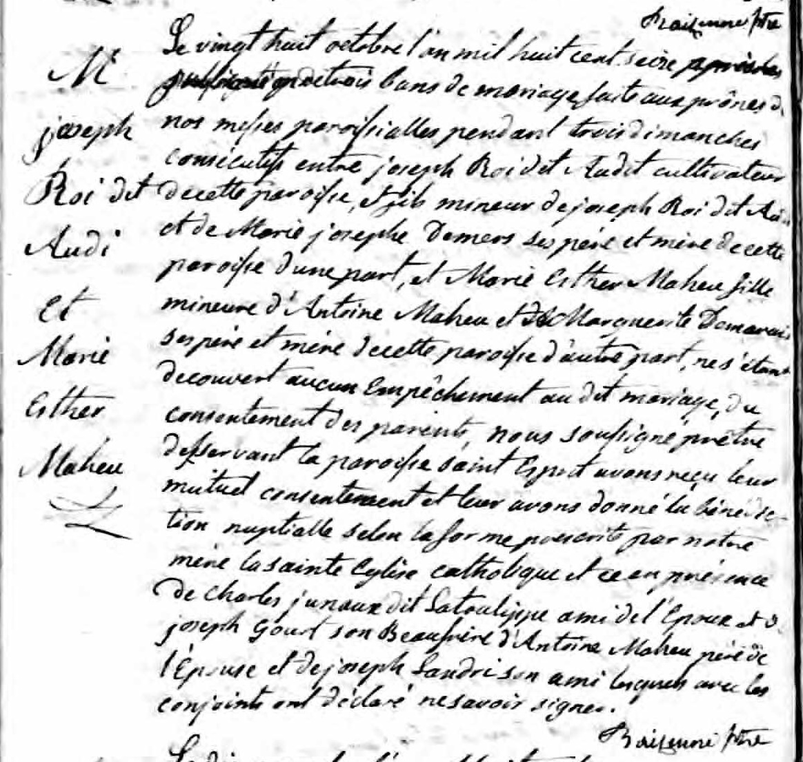 Marriage Record of Joseph Roi and Marie-Esther Maheu