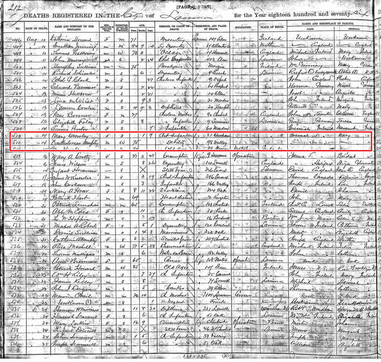 Death Record of Bartholomew Murphy