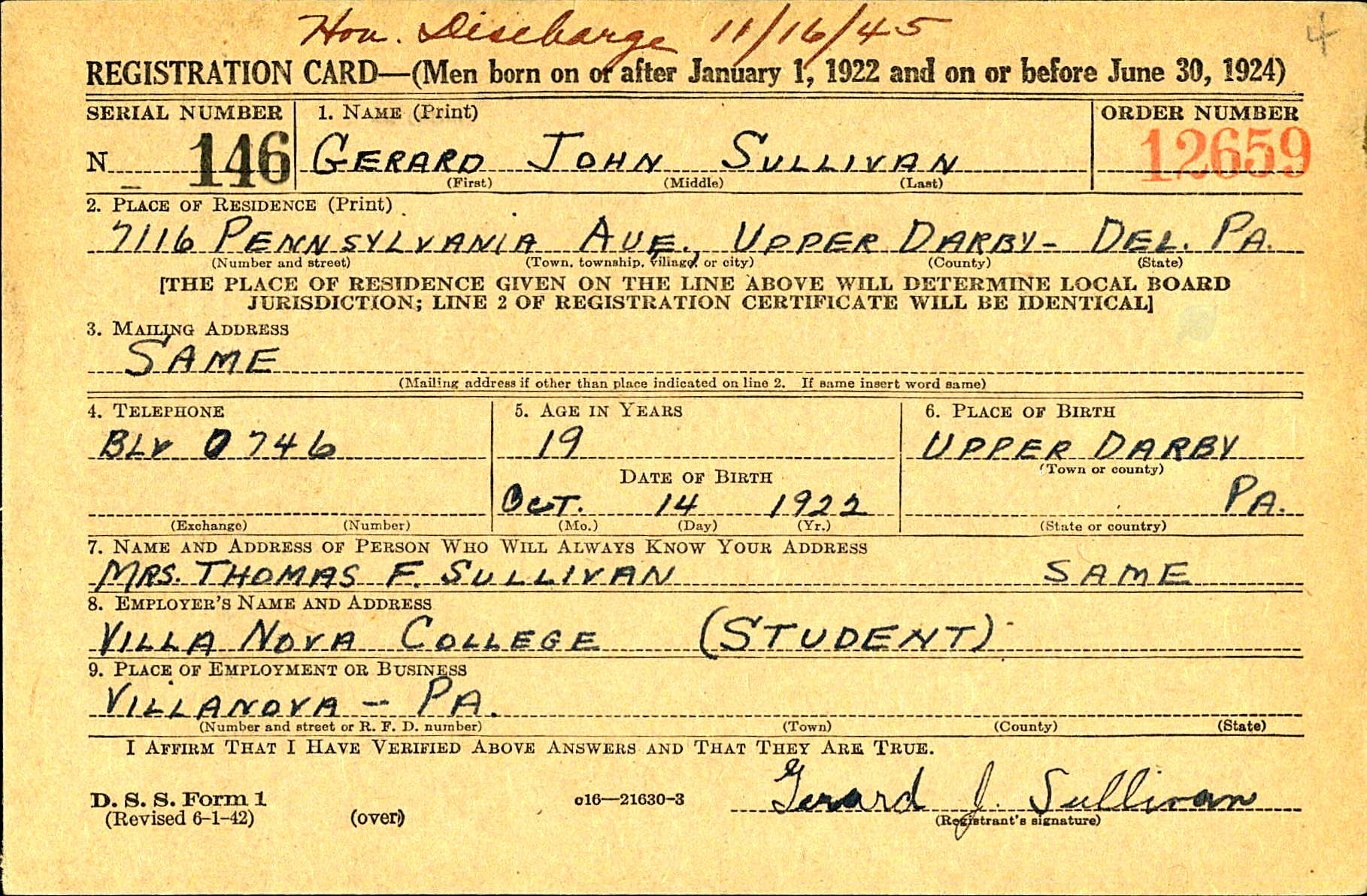 World War II Draft Registration Card of Gerard John Sullivan