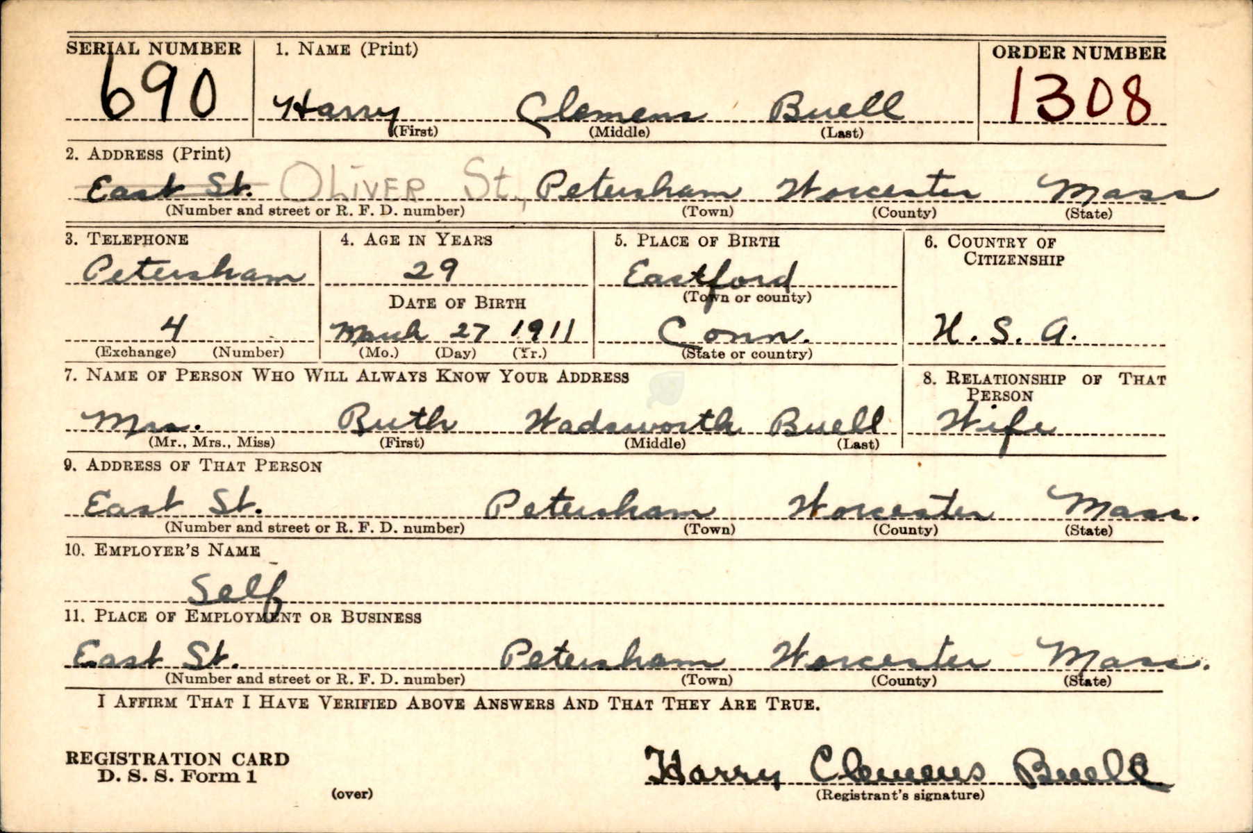 World War II Draft Registration Card of Harry Clement Buell