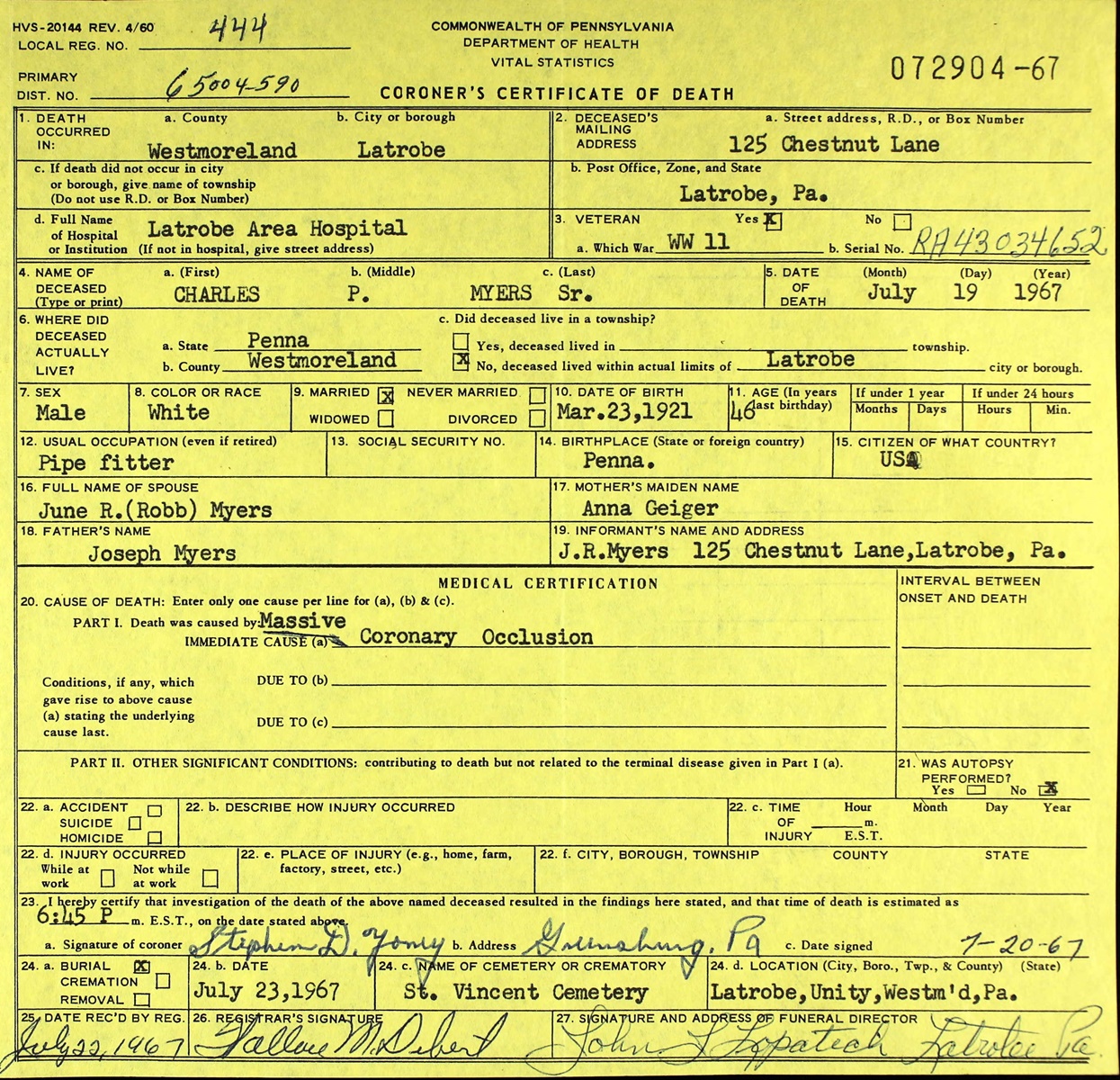 Coroner's Certificate of Death for Charles P. Myers Sr.