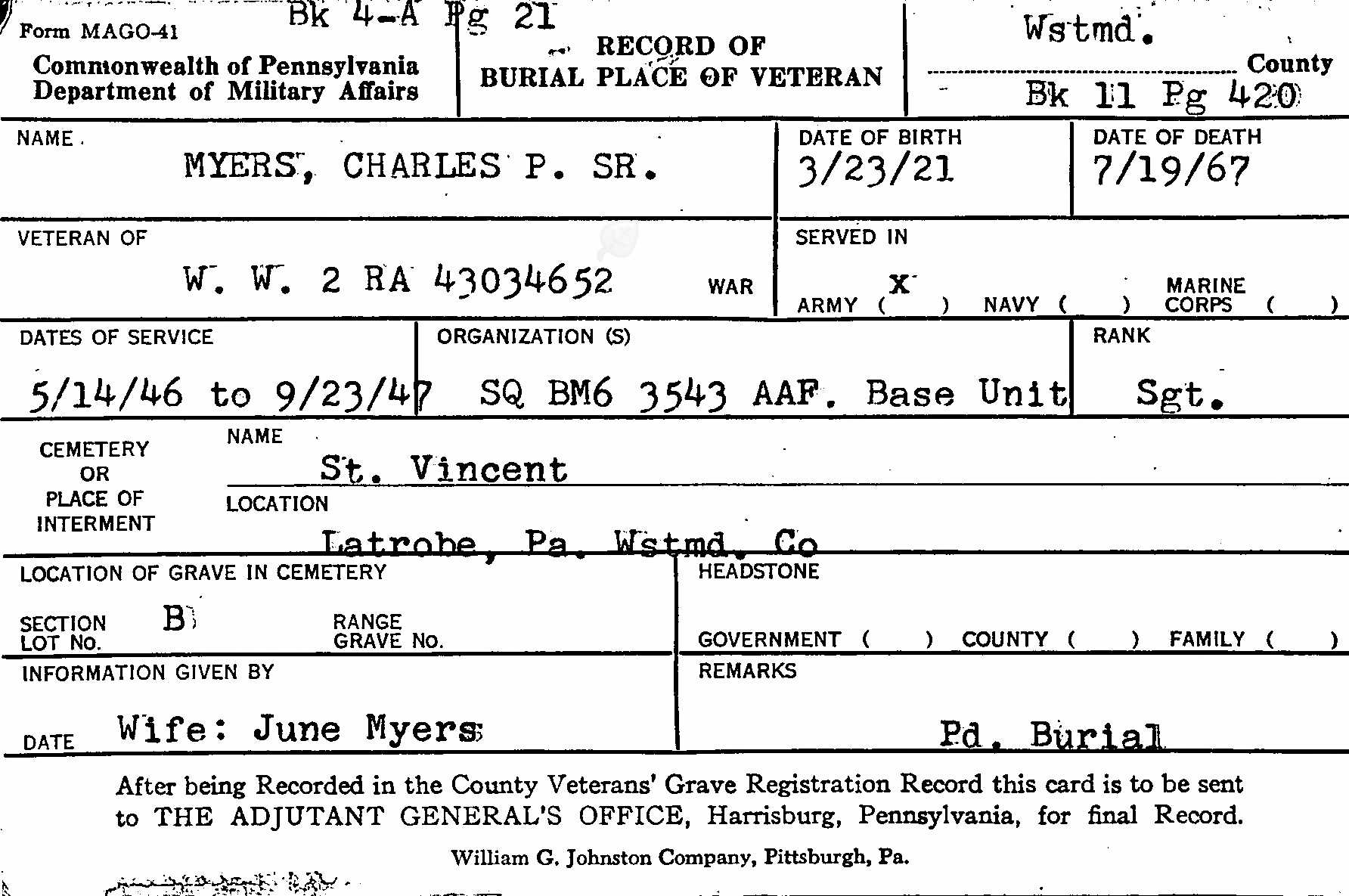 Burial Card of Charles P. Myers Sr.