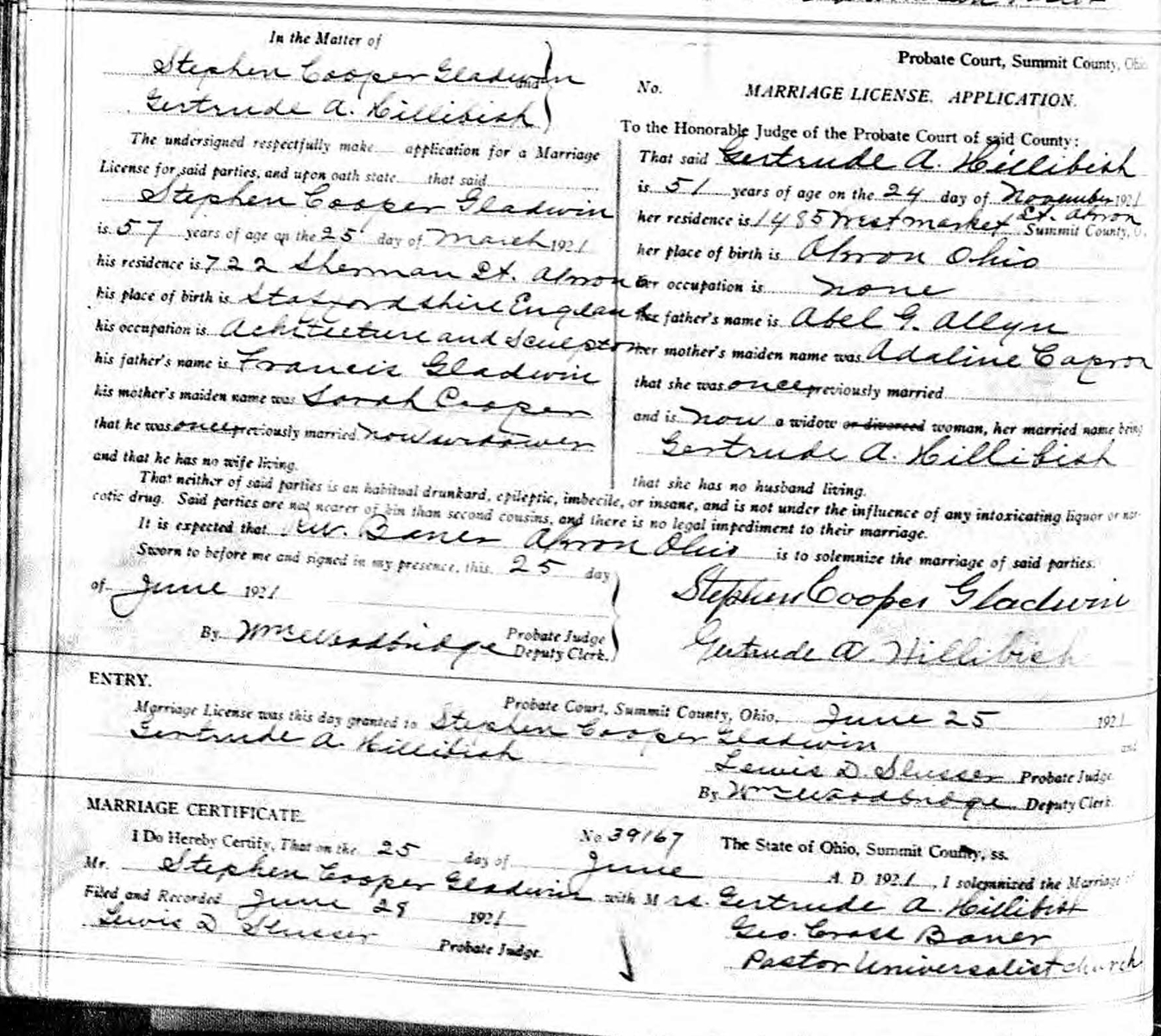 Marriage Record of Gertrude Hillibish and Stephen Cooper Gladwin