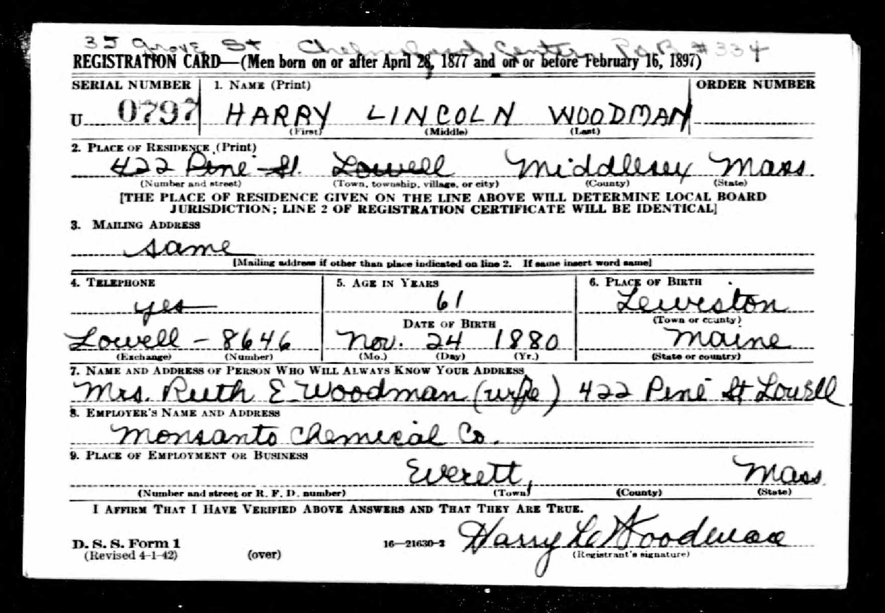 World War II Draft Registration of Harry Lincoln Woodman
