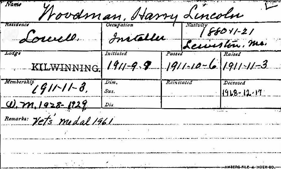 Masonic Membership card of Harry L. Woodman