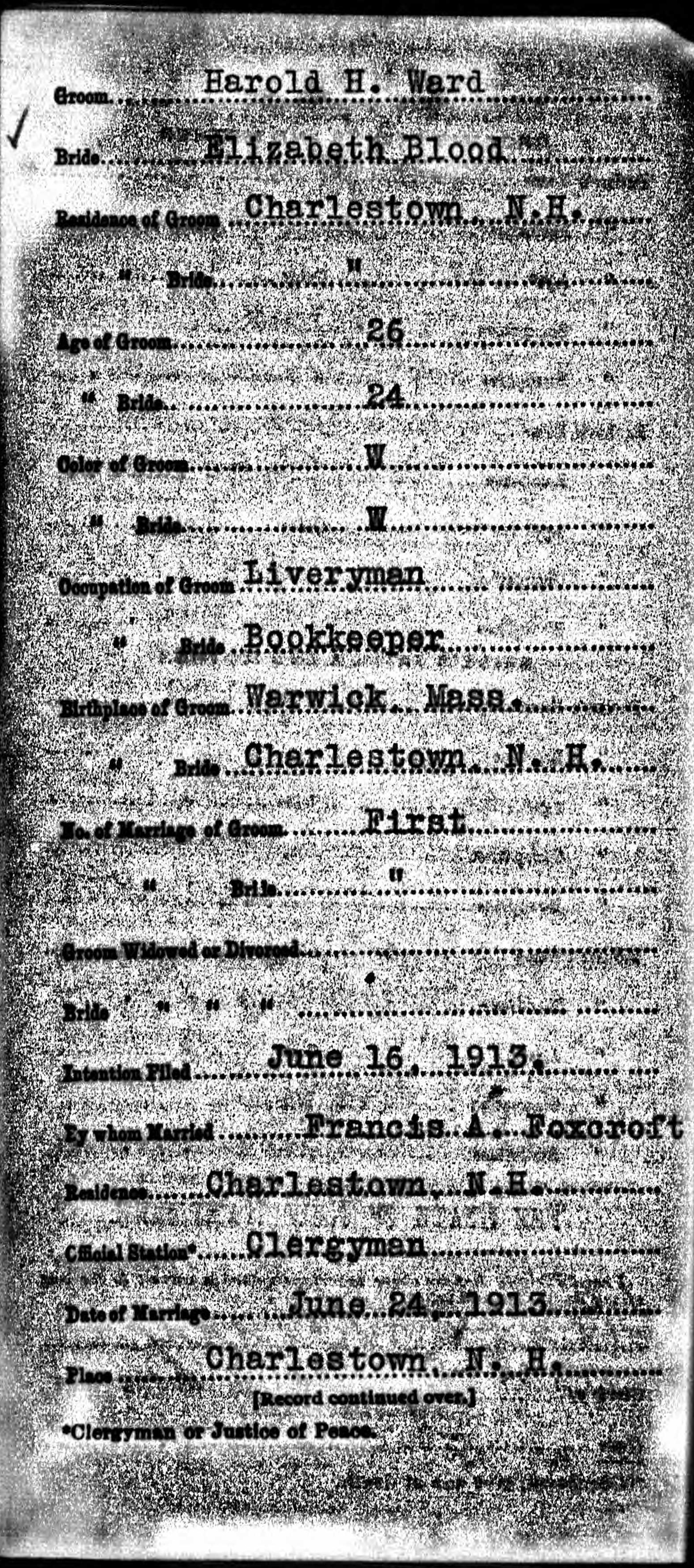 Marriage Record of Elizabeth Blood and Harold H. Ward