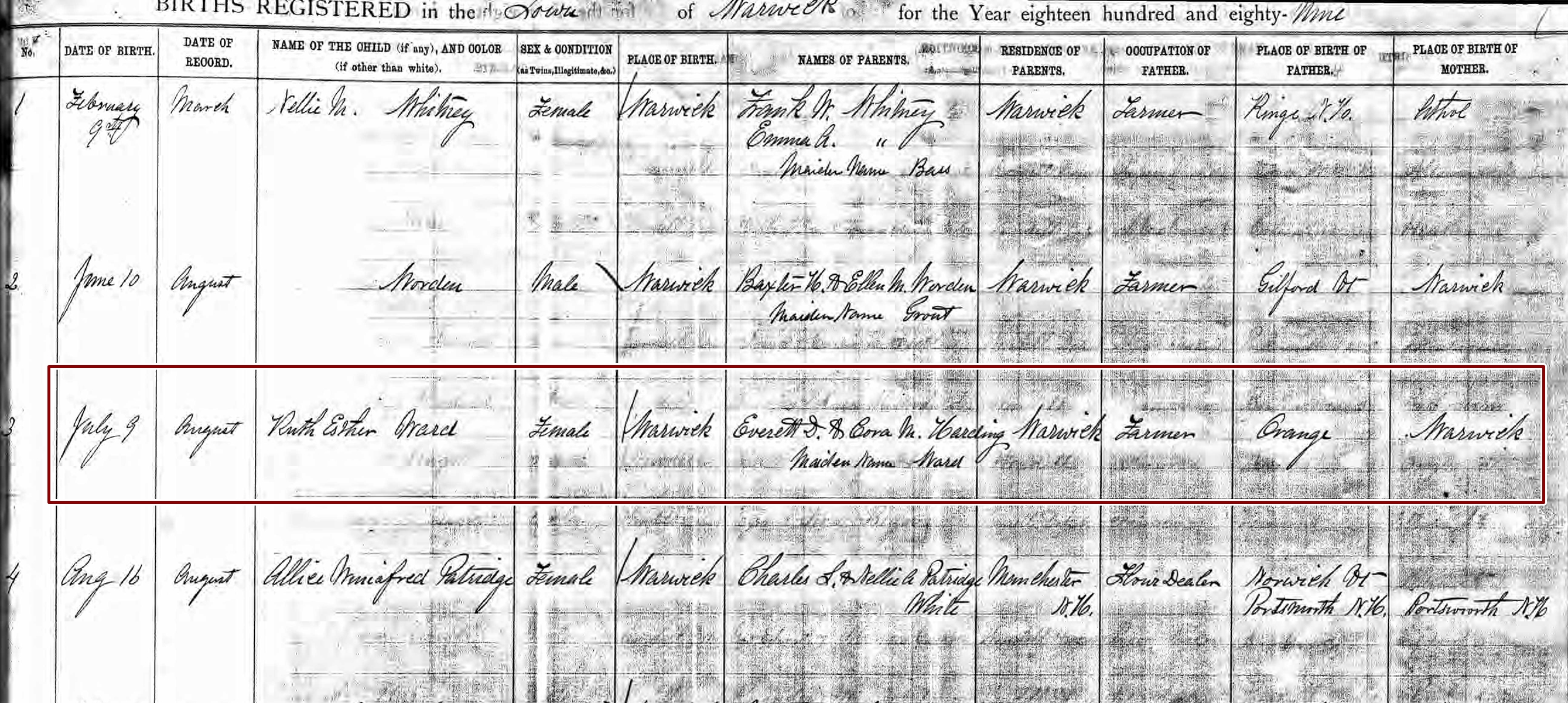 Birth Record of Ruth Esther Ward