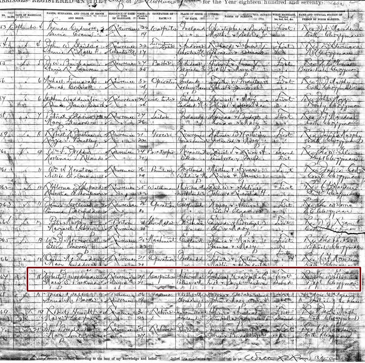 Marriage Record of Mary E. Parkman and Herbert J. Woodman