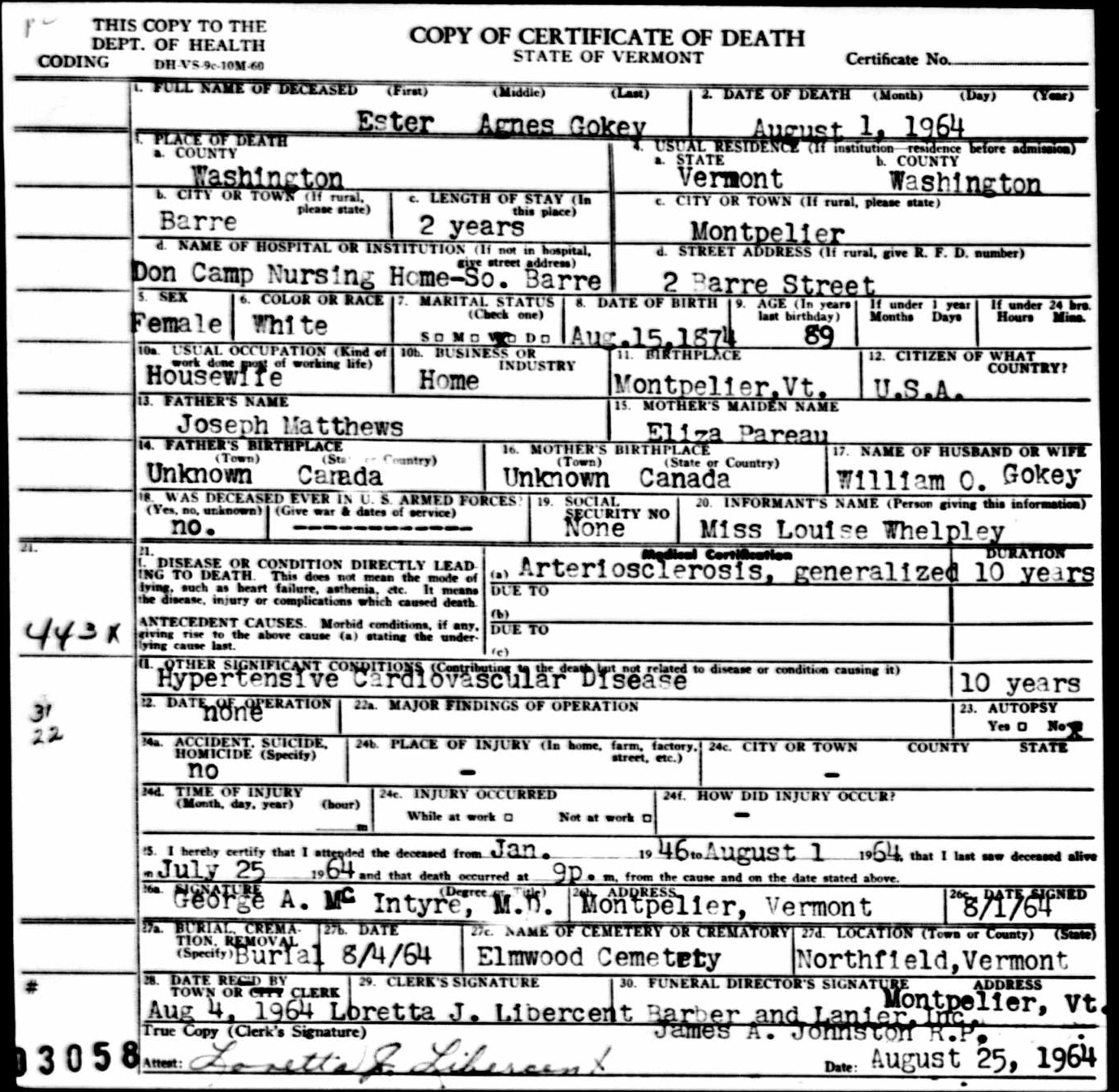 Death Certificate of Ester (Matthews) Gokey