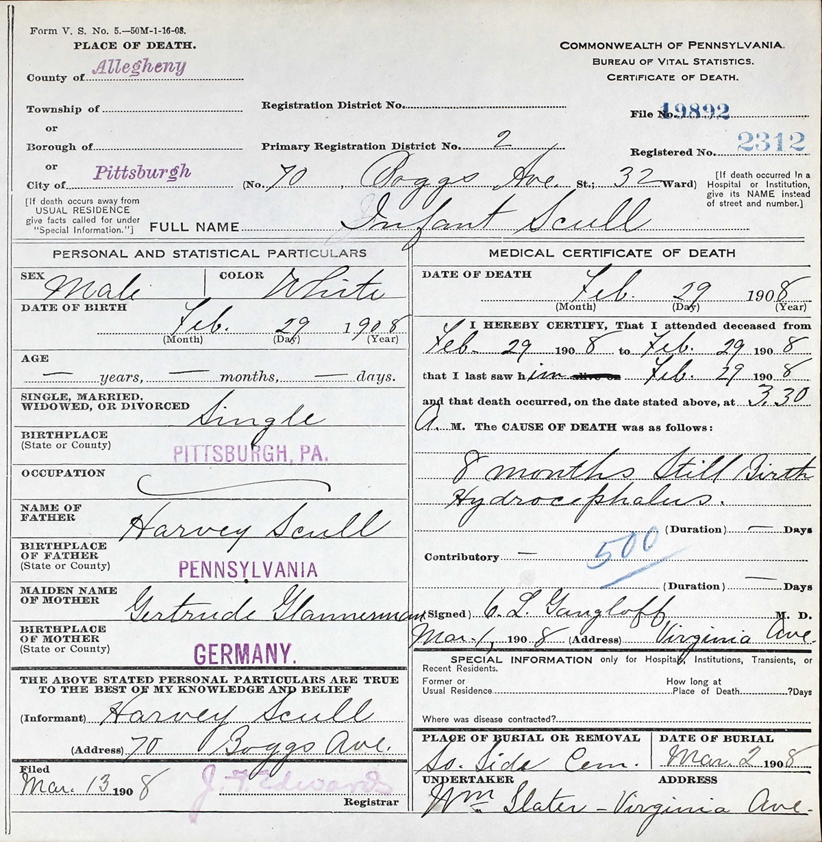 Certificate of Death for infant boy Scully