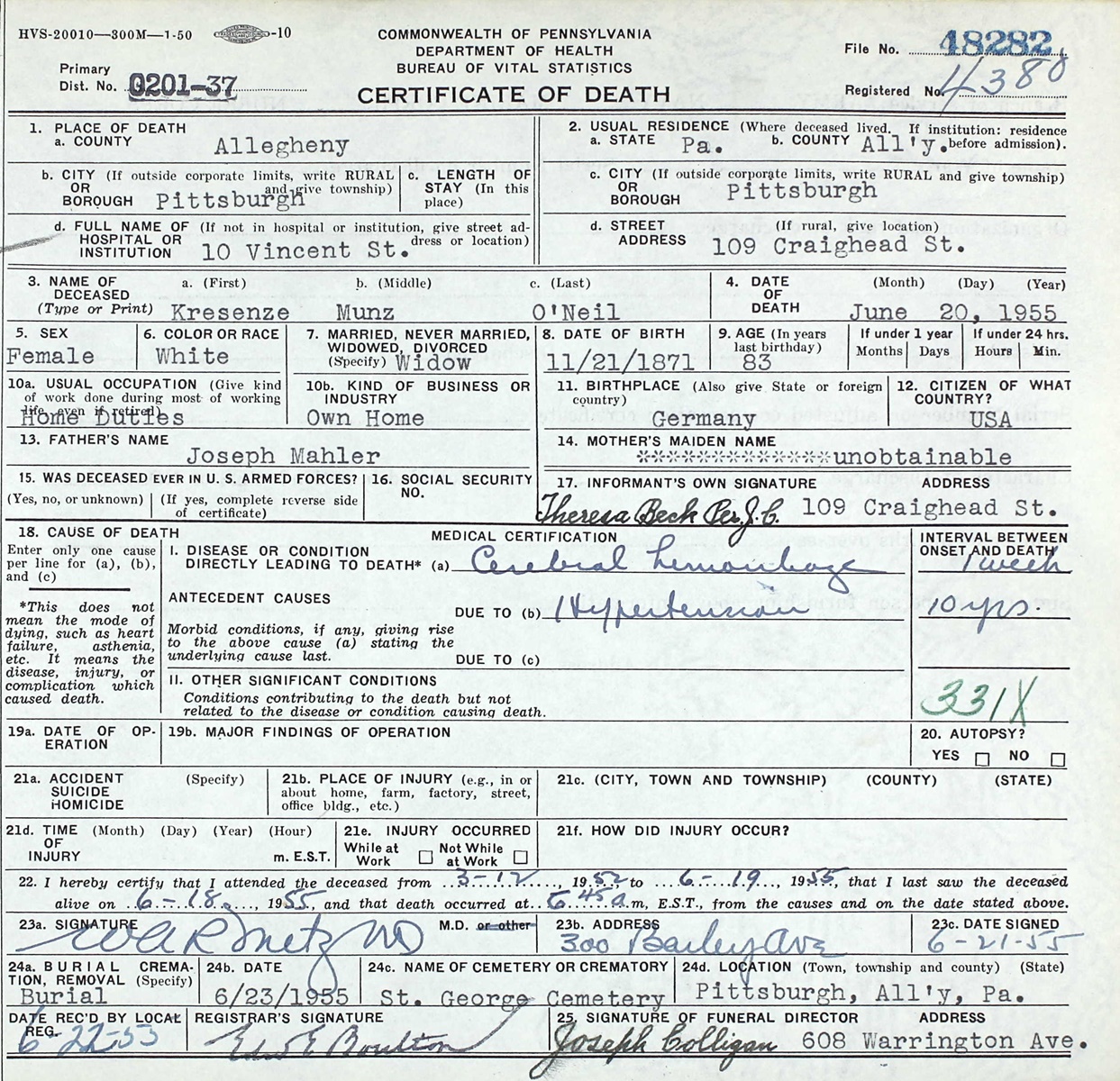 Certificate of Death for Kresenze O'Neil