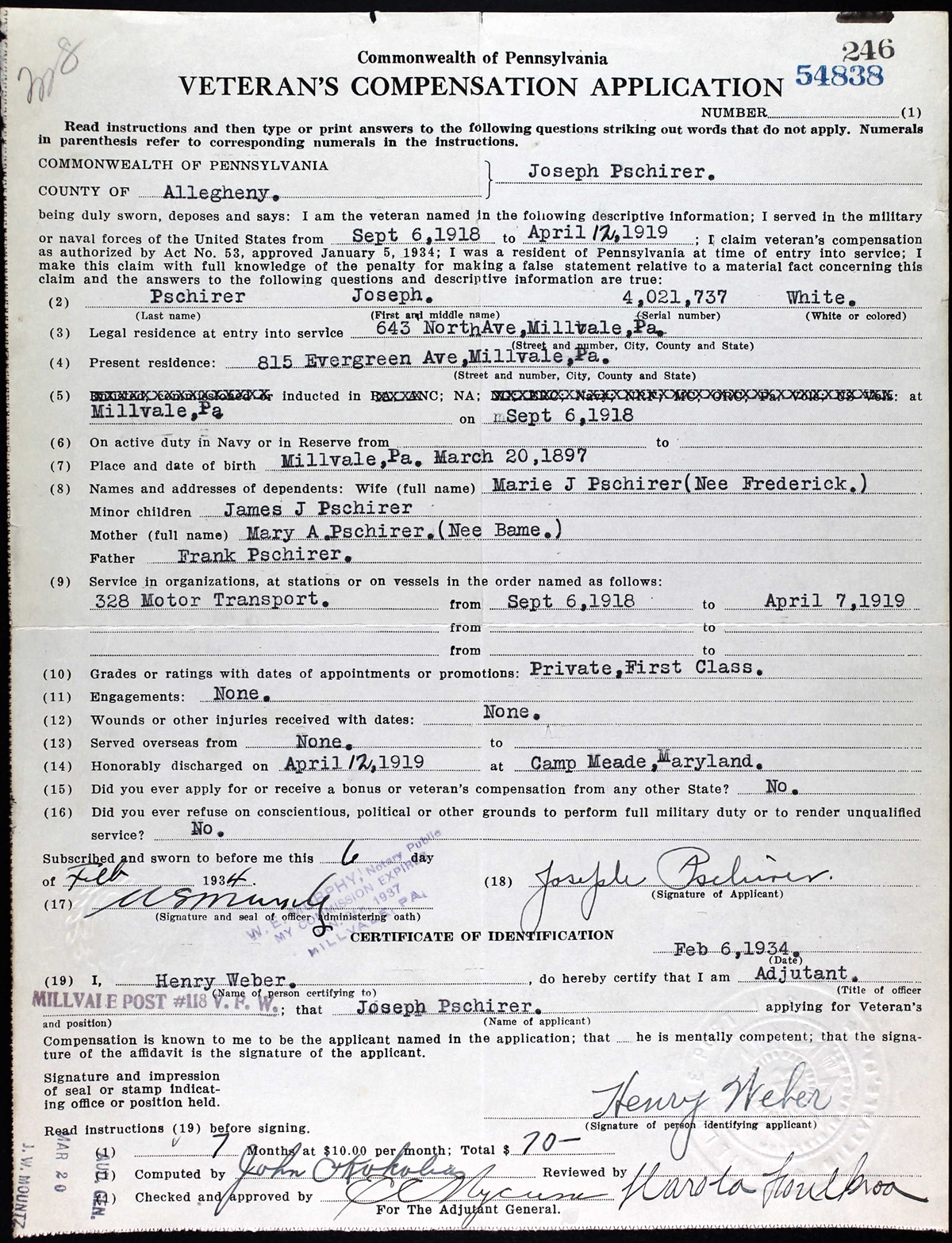 Joseph Pschirer's Veteran's Compensation Application
