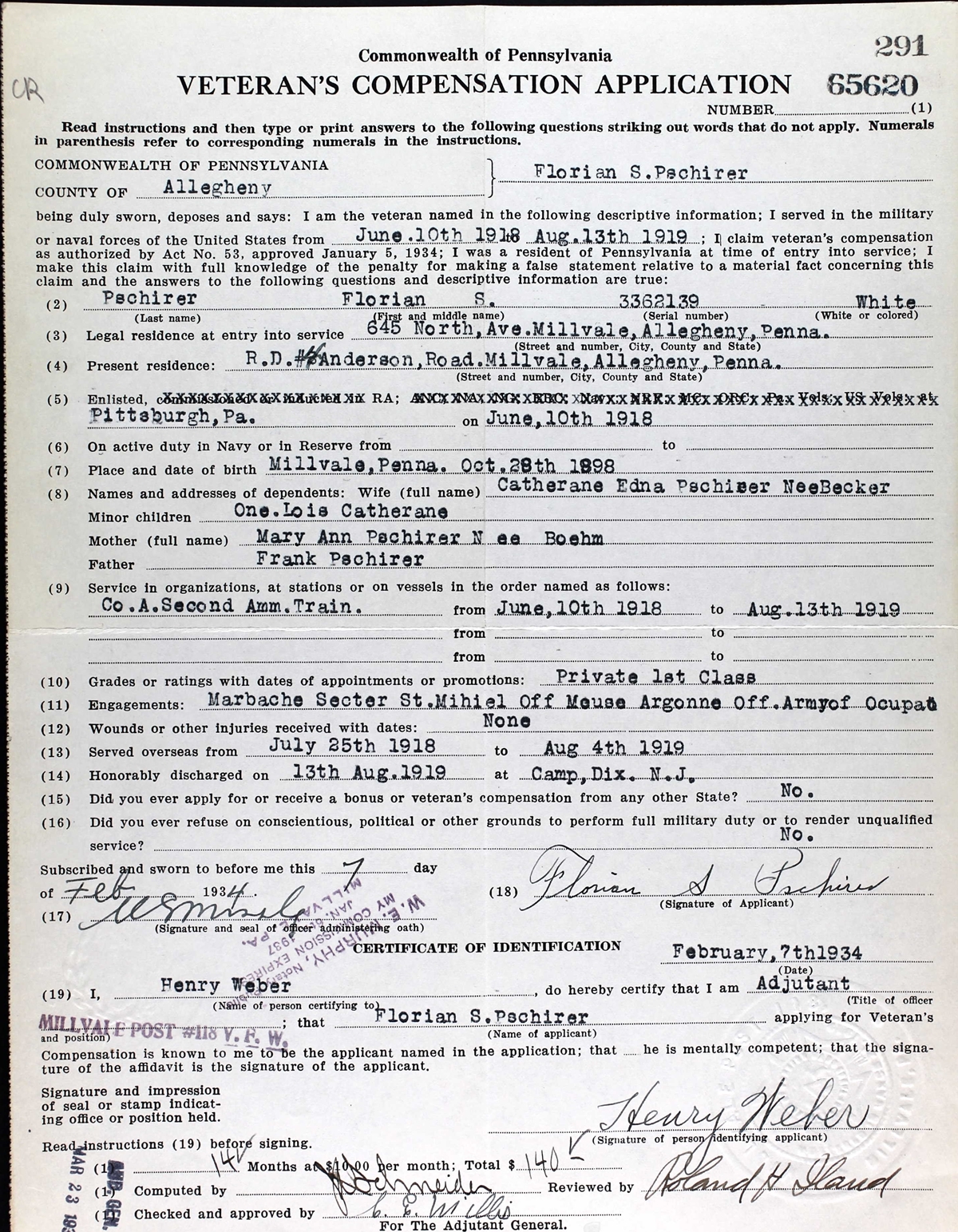 Veteran's Compensation Application of Florian Pschirer