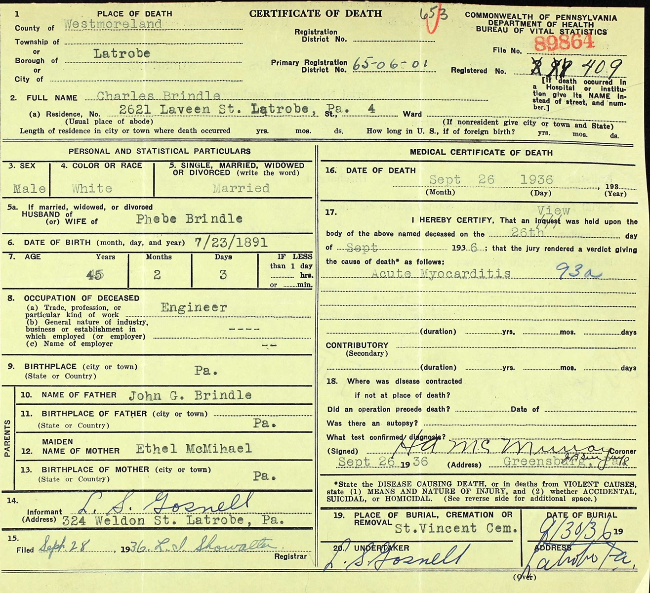 Certificate of Death of Charles Brindle