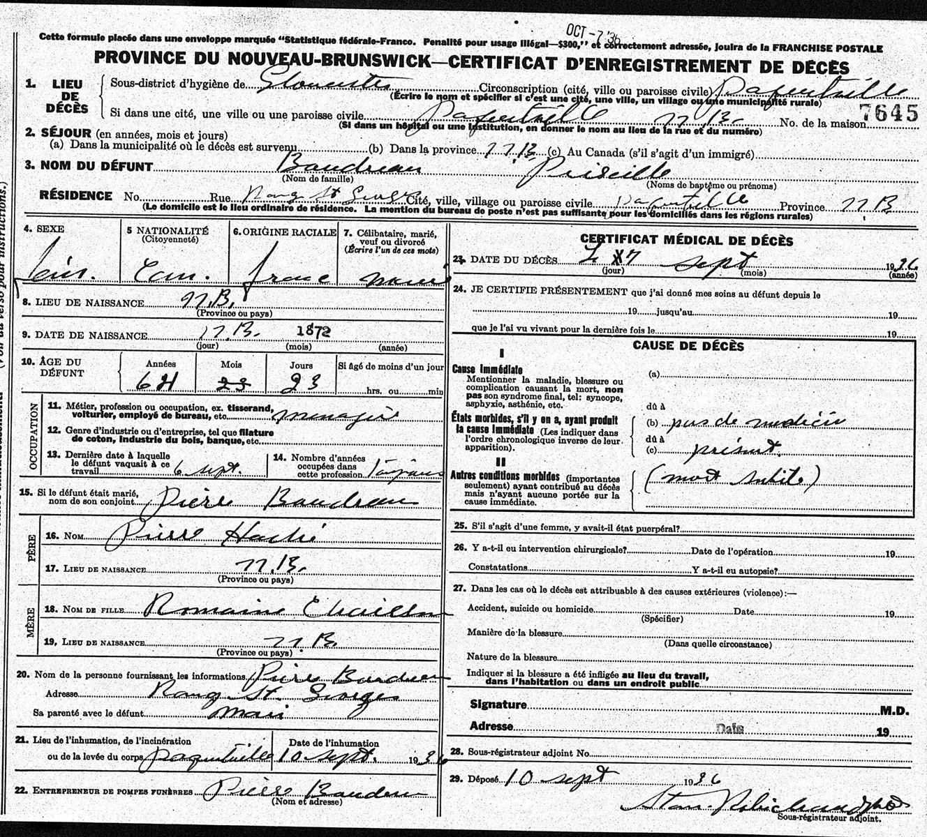 Certificat d'Enregistrement de Déces for Pricille Boudreau
