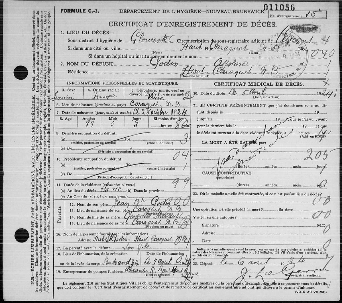 Death Certificate of Appoline Godin