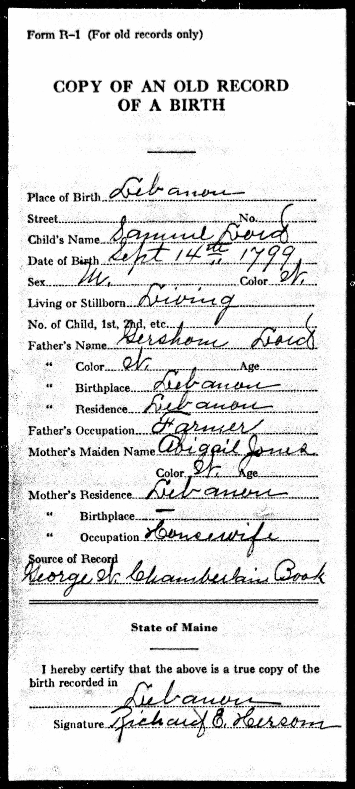 Birth Record of Samuel Lord