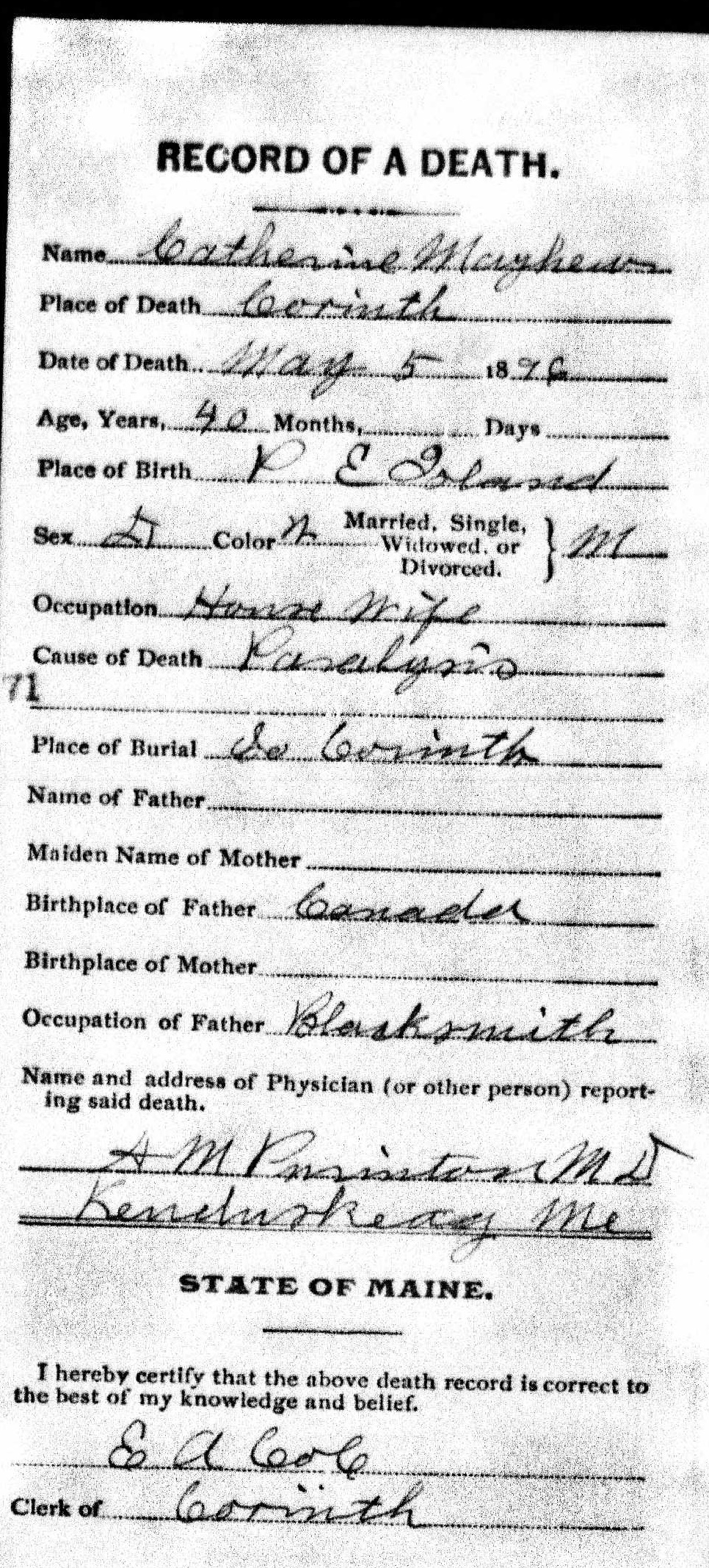 Death Record of Catherine Mayhew