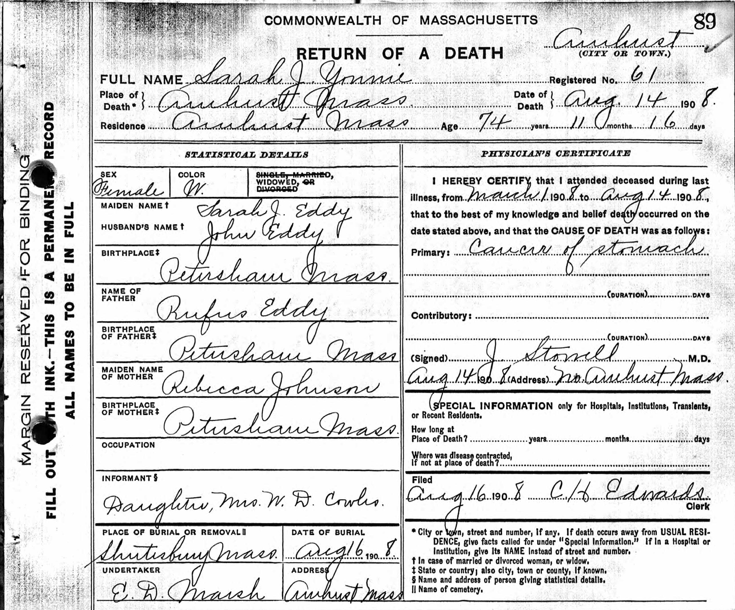 Death Record of Sarah J. Yonnie