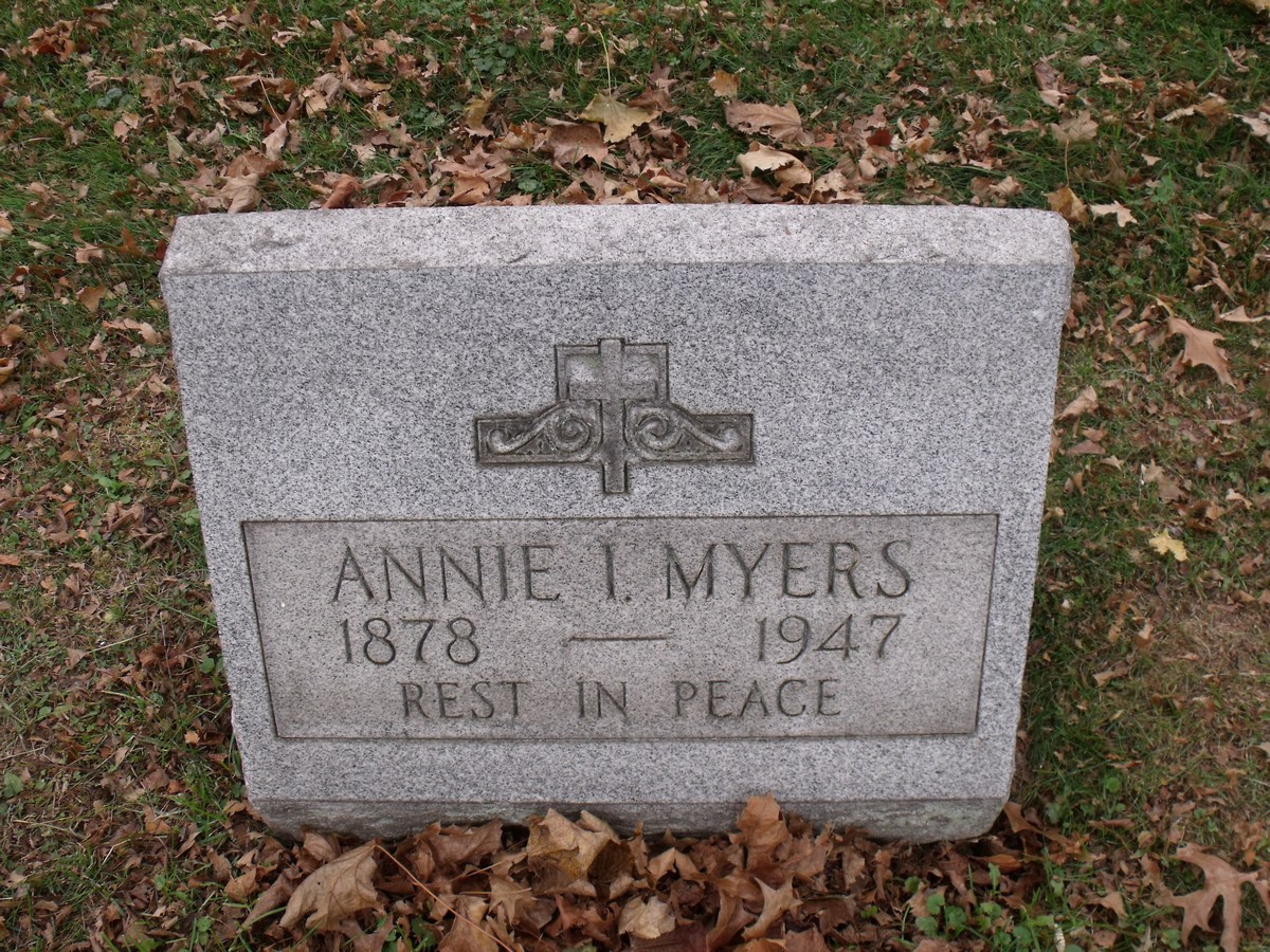 Anna Isabelle Geiger, age 23, married Joseph Lucas Myers, age 34 , son of Lucas Myers and Mary Huffman, on 4 June 1901 at Westmoreland County, Pennsylvania.6,3 Anna, age 31 years, and Joseph, age 43 years, appeared on the US Census of 1910 on 335 Spring Street, Latrobe, Westmoreland County, Pennsylvania.7 Anna, age 41 years, and Joseph, age 53 years, appeared on the US Census of 1920 on 333 Spring Street, Latrobe, Westmoreland County, Pennsylvania.8 Anna, age 51 years, and Joseph, age 63 years, appeared on the US Census of 1930 on 335 Spring Street, Latrobe, Westmoreland County, Pennsylvania.9 At the time of her husband's death, November 1938, she lived at 335 Spring Street, Latrobe, Westmoreland County, Pennsylvania.10 Anna, age 61 years, appeared on the US Census of 1940 at 335 Spring Street, Latrobe, Westmoreland County, Pennsylvania.11 According to the Federal Census in 1940, Anna was a widow.11 In 1947, the year Anna died, she lived at 335 Spring Street, Latrobe, Westmoreland County, Pennsylvania.4 She died on 15 August 1947 at the Latrobe Hospital, Latrobe, Westmoreland County, Pennsylvania, at age 69 from a coronary thrombosis.2,4