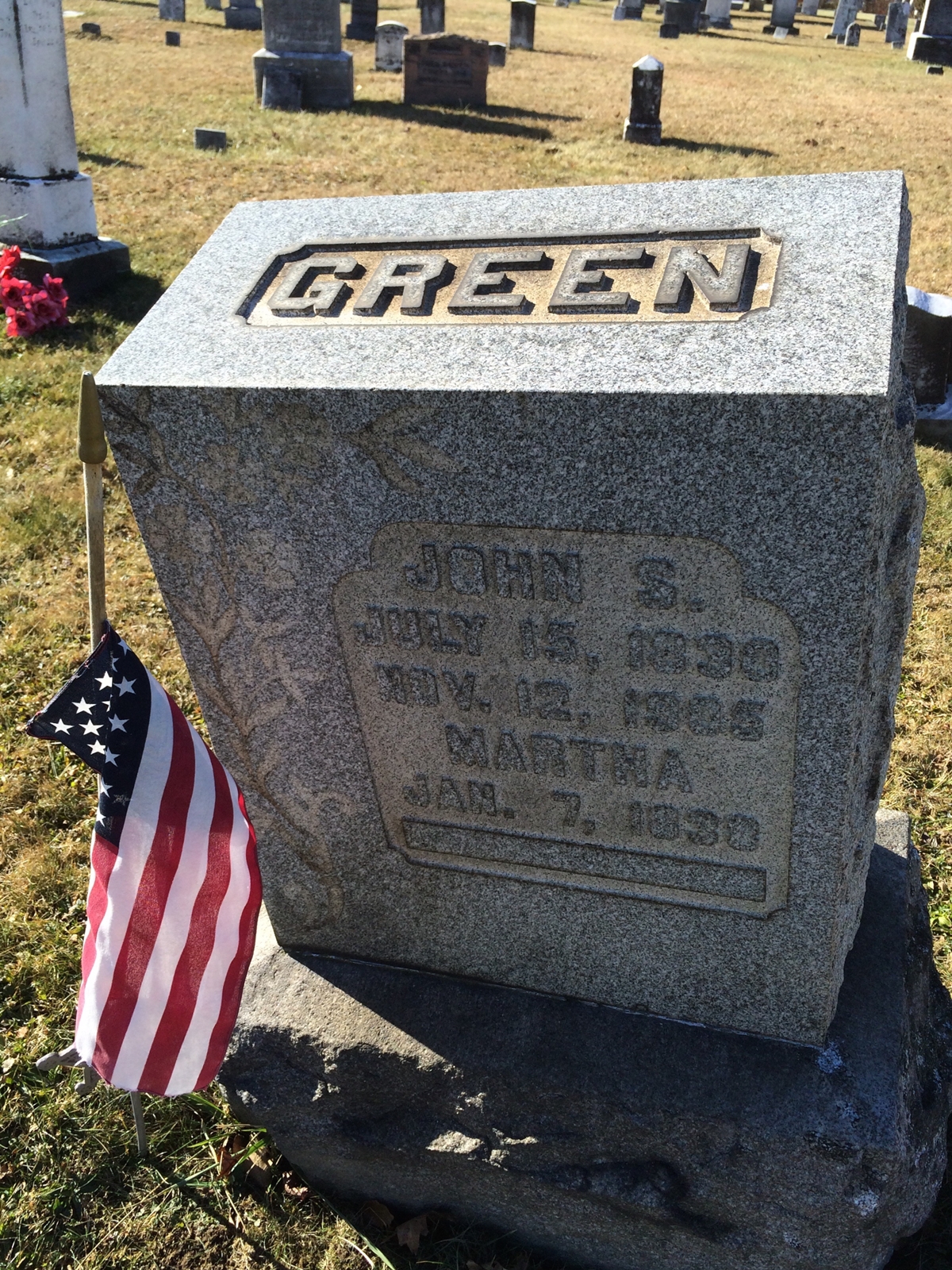 John S. Green died on 12 November 1905 at Penn Run, Indiana County, Pennsylvania, at age 75. He was buried on 14 November 1905 at Manor Cemetery, Penn Run, Indiana County, Pennsylvania.