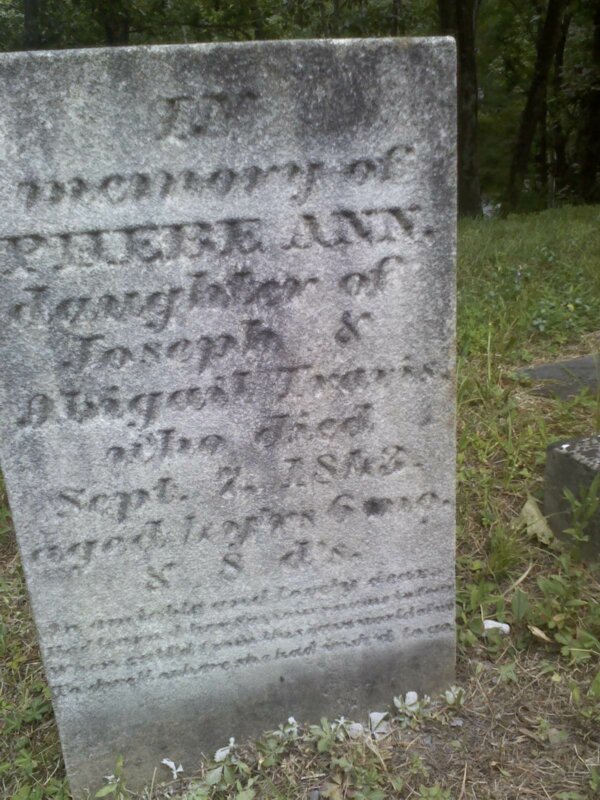 Phebe Ann Travis was born on 27 February 1839 at Yorktown, Westchester County, New York. She was the daughter of Joseph Travis and Abigail Tompkins. Phebe Ann Travis died on 7 September 1842 at Yorktown, Westchester County, New York, at age 3. She was buried at Yorktown Church Cemetery, Yorktown, Westchester County, New York. Phebe's epitaph reads: