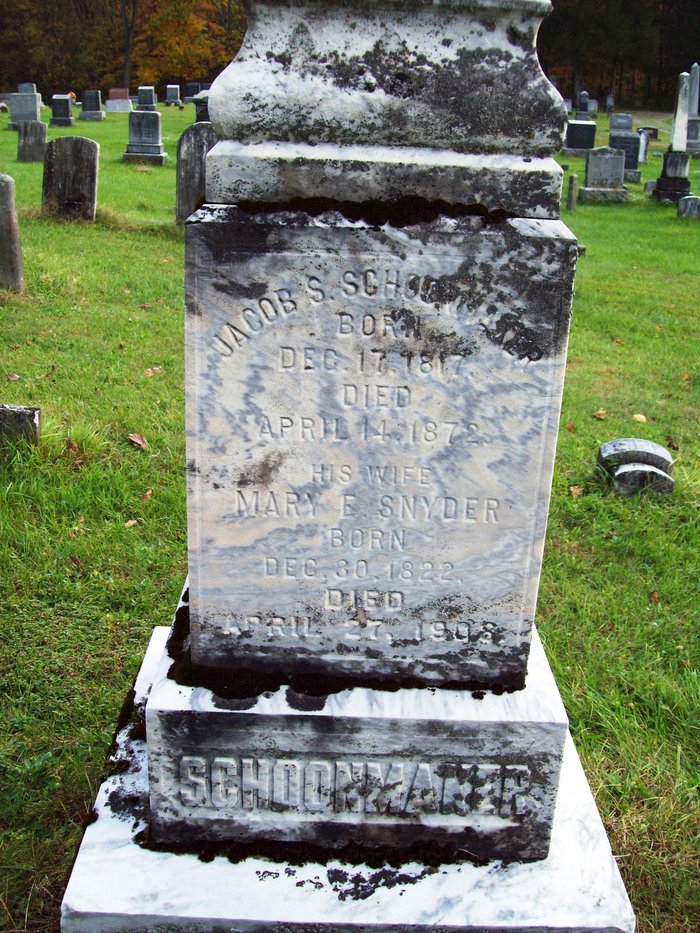 Jacob Snyder Schoonmaker died on 14 April 1872 at Marbletown, Ulster County, New York, at age 54. He was buried at Marbletown Cemetery, Marbletown, Ulster County, New York.