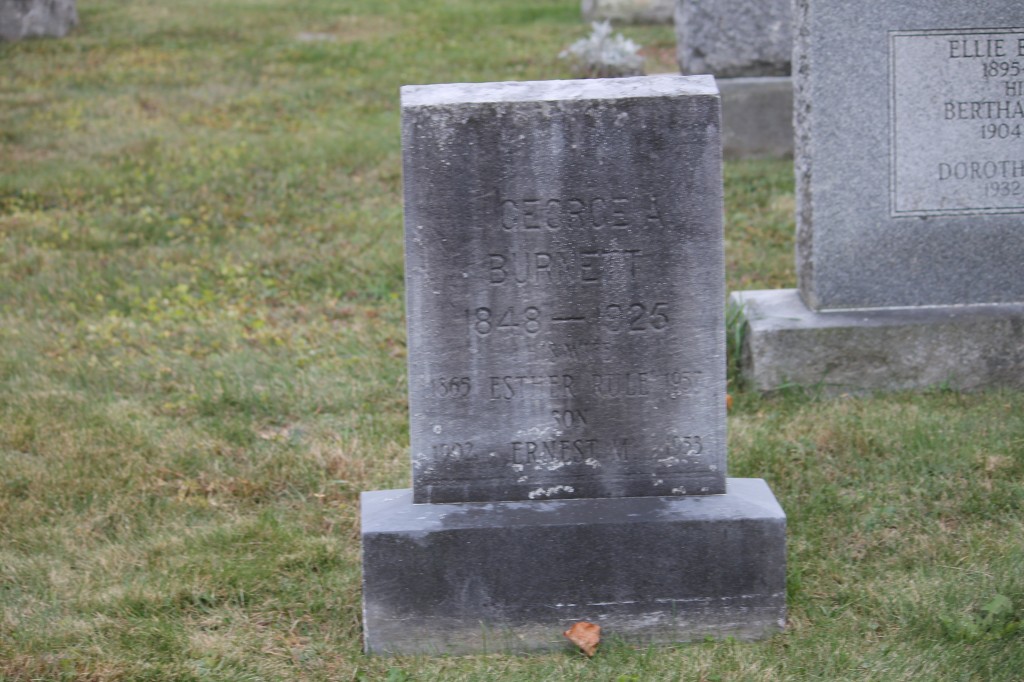 George A. Burnett died on 27 November 1925 at Newport, New Hampshire, at age 76 from heart disease. He was buried on 24 October 1934 at Pine Grove Cemetery, Newport, New Hampshire, in section c, lot 4.